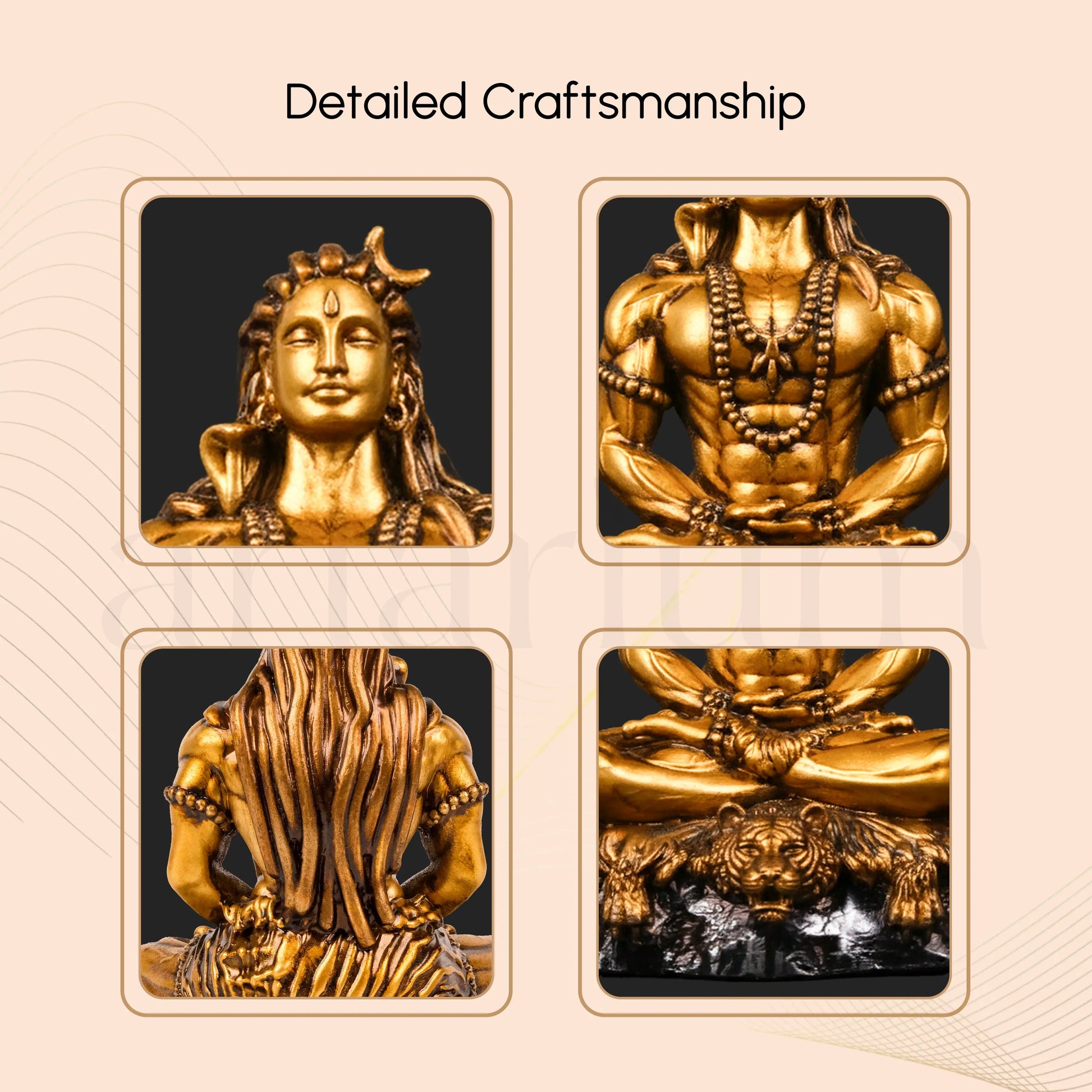 From the lush green foothills of Tamil Nadu to the heart of your home, this serene Adiyogi Shiva Statue is a tribute to the meditative form of Lord Shiva, the first Yogi and the teacher of Yoga. His face, immersed in blissful trance, mirrors the majestic Adiyogi statue in Coimbatore, while his body rests in the principal Yogic posture. Resting on a tiger skin atop a rocky base, this sculpture honors Shiva’s omniscient presence - a symbol of wisdom and spiritual awakening.