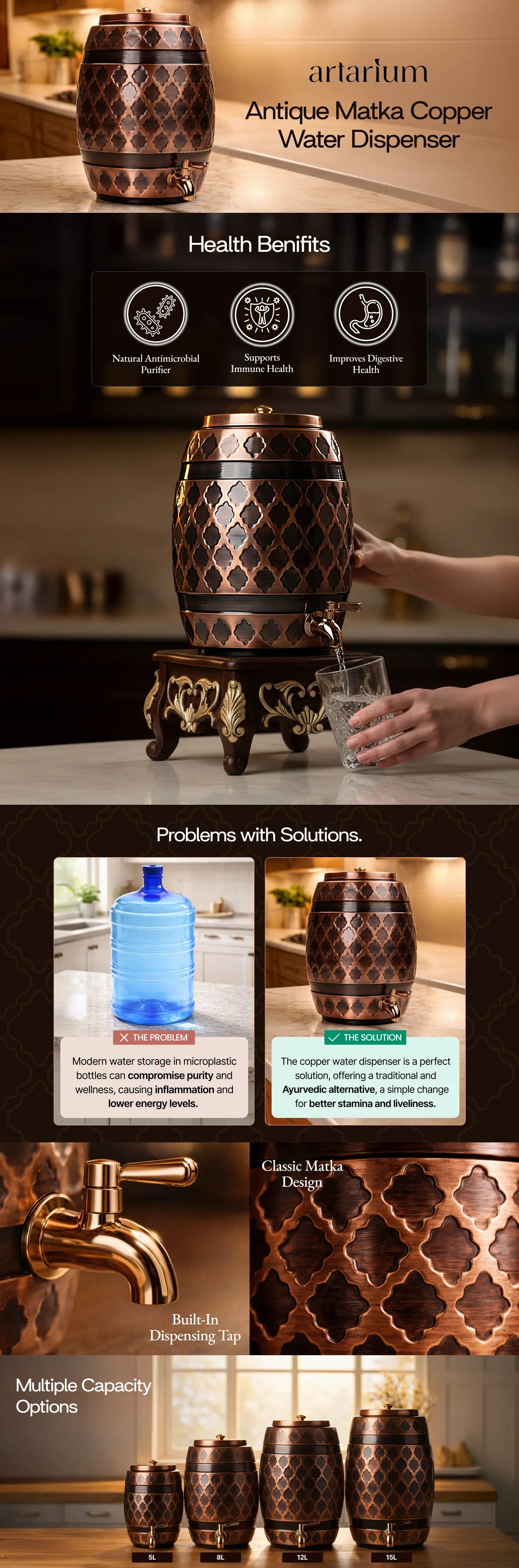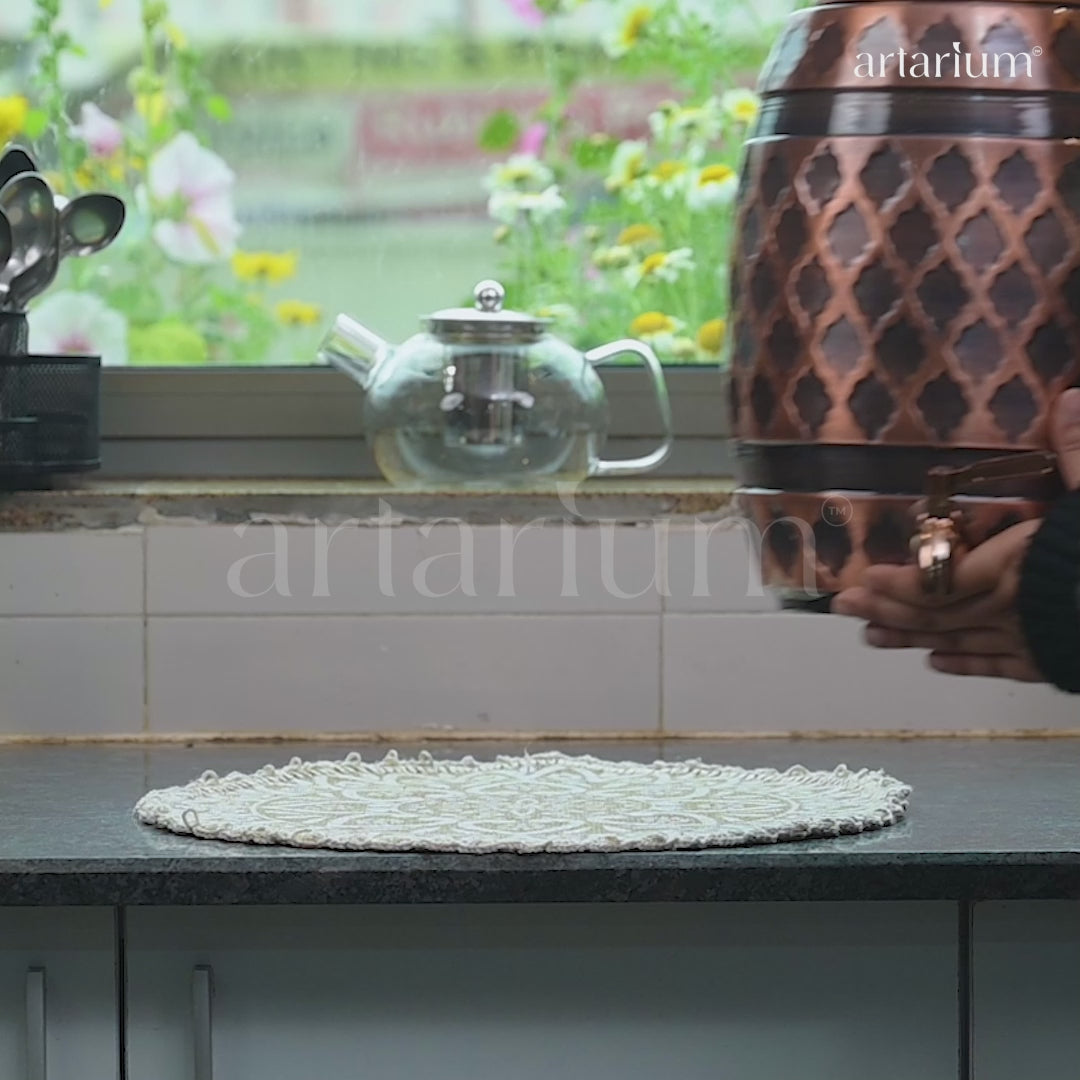 Upgrade your hydration with the Artarium Antique Copper Matka Water Dispenser, a perfect blend of traditional elegance and modern utility. Made with pure copper, this stylish copper water storage pot is inspired by the classic matka design, known for supporting Ayurvedic health benefits and natural water purification. The durable build with a smooth tap ensures easy dispensing, making it ideal for daily use in the kitchen, dining table, office, or home decor. Copper is widely known to help maintain immunity and digestion, making this a smart wellness choice. Available in 5, 8, 12, and 16 litres, this copper water dispenser with tap is perfect for families and gatherings. Add a touch of heritage with this handcrafted copper matka that combines functionality, health, and luxury in one timeless product.