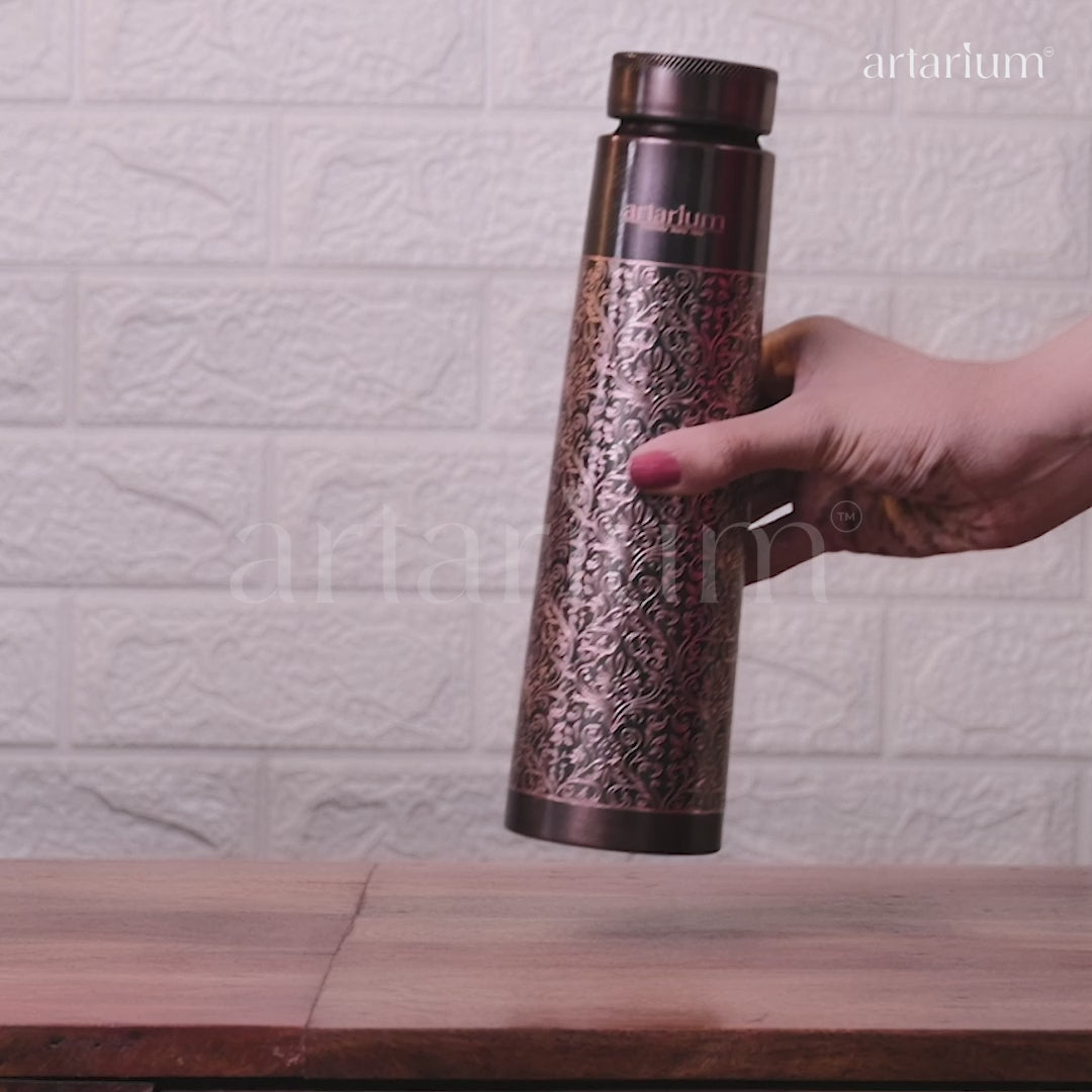 The Antique Etching Copper Bottle with Cups (Set of 2) brings seamless functionality to a charming form. Crafted from pure copper with elaborate engravings, this bottle offers you a chance to level up your hydration game without missing a beat. Its unique etchings add a touch of vintage elegance, while the natural copper properties help purify water and support your wellness with every sip. Lightweight yet durable, this set is perfect for daily use at home, in the office, or as a thoughtful gift.