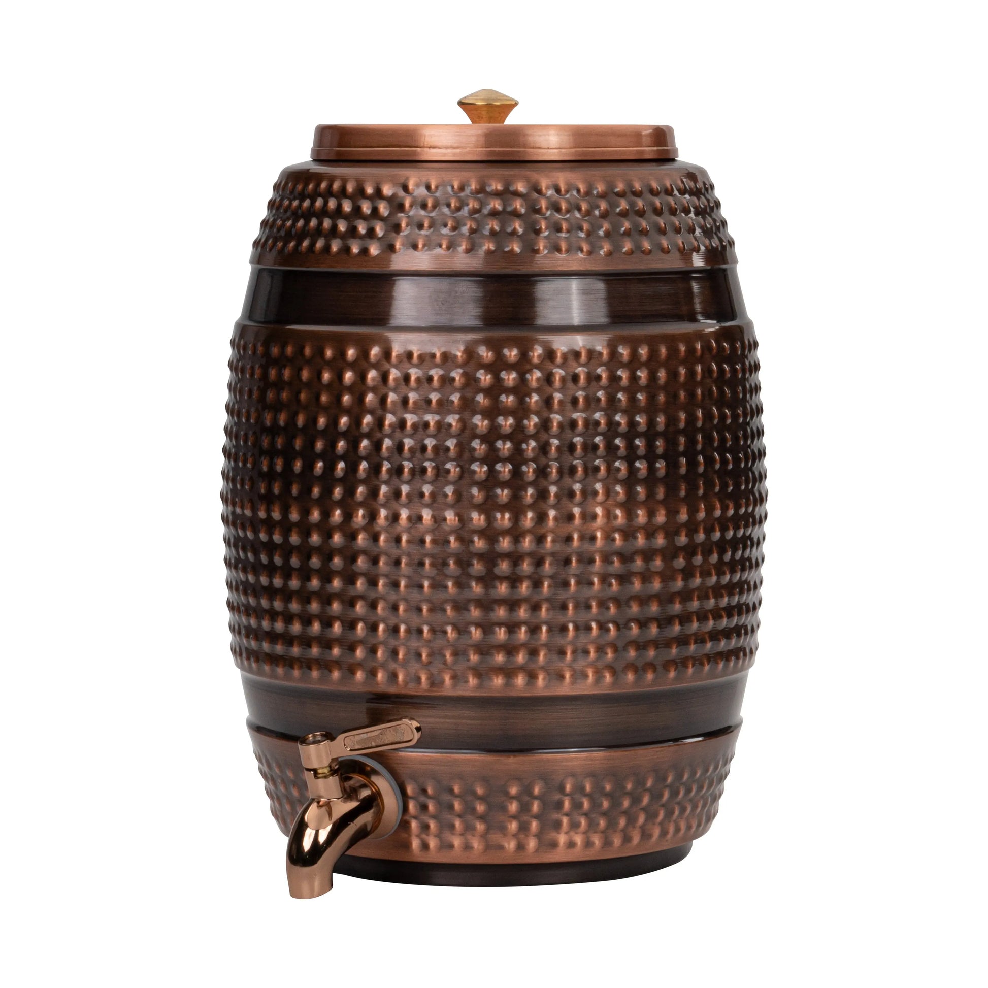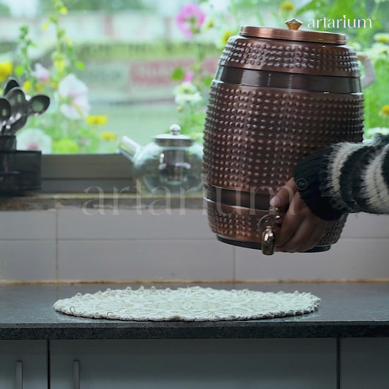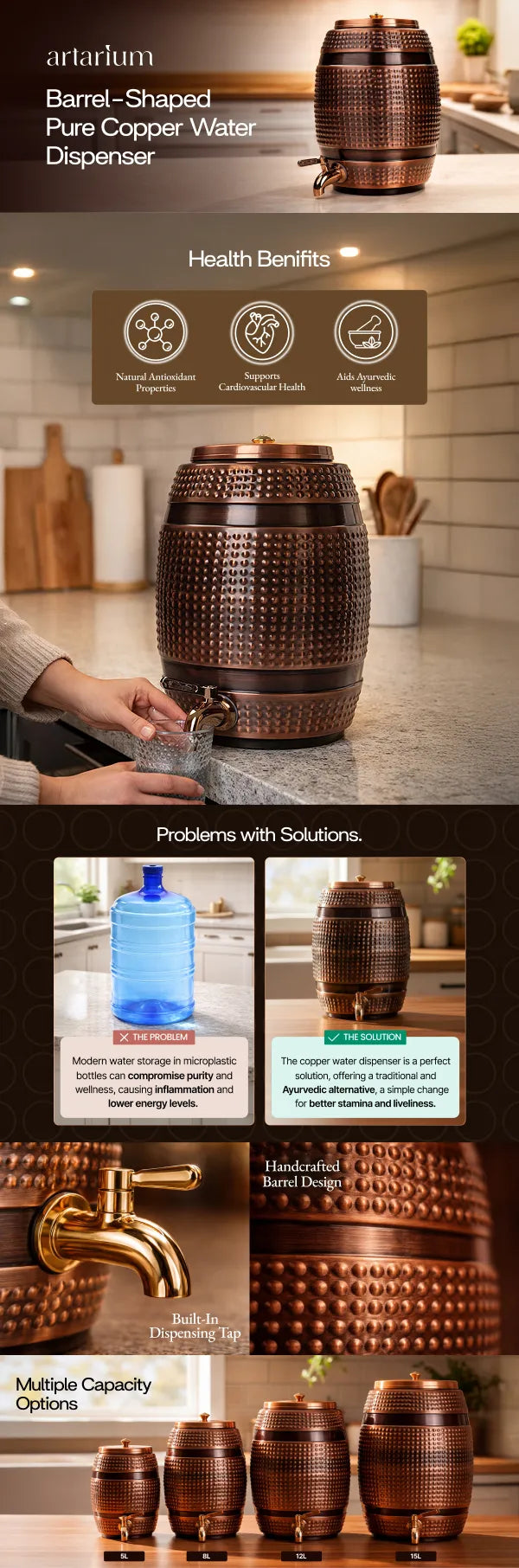 Upgrade your kitchen with the Barrel - Shaped Pure Copper Water Dispenser from Artarium - a perfect blend of tradition, health, and elegance. Crafted from 100% pure copper, this premium copper water storage tank naturally helps support immunity, digestion, and overall wellness, inspired by Ayurvedic benefits of drinking copper-infused water. The stylish hammered barrel design with a sturdy lid and leak - proof brass tap makes it ideal for daily hydration at home, office, or gatherings. Available in 5, 8, 12, and 16 litres, it offers ample capacity for family use while enhancing your kitchen decor. Durable, rust-resistant, and easy to clean, this copper water dispenser with tap is a must-have for healthy living and modern kitchenware collections.