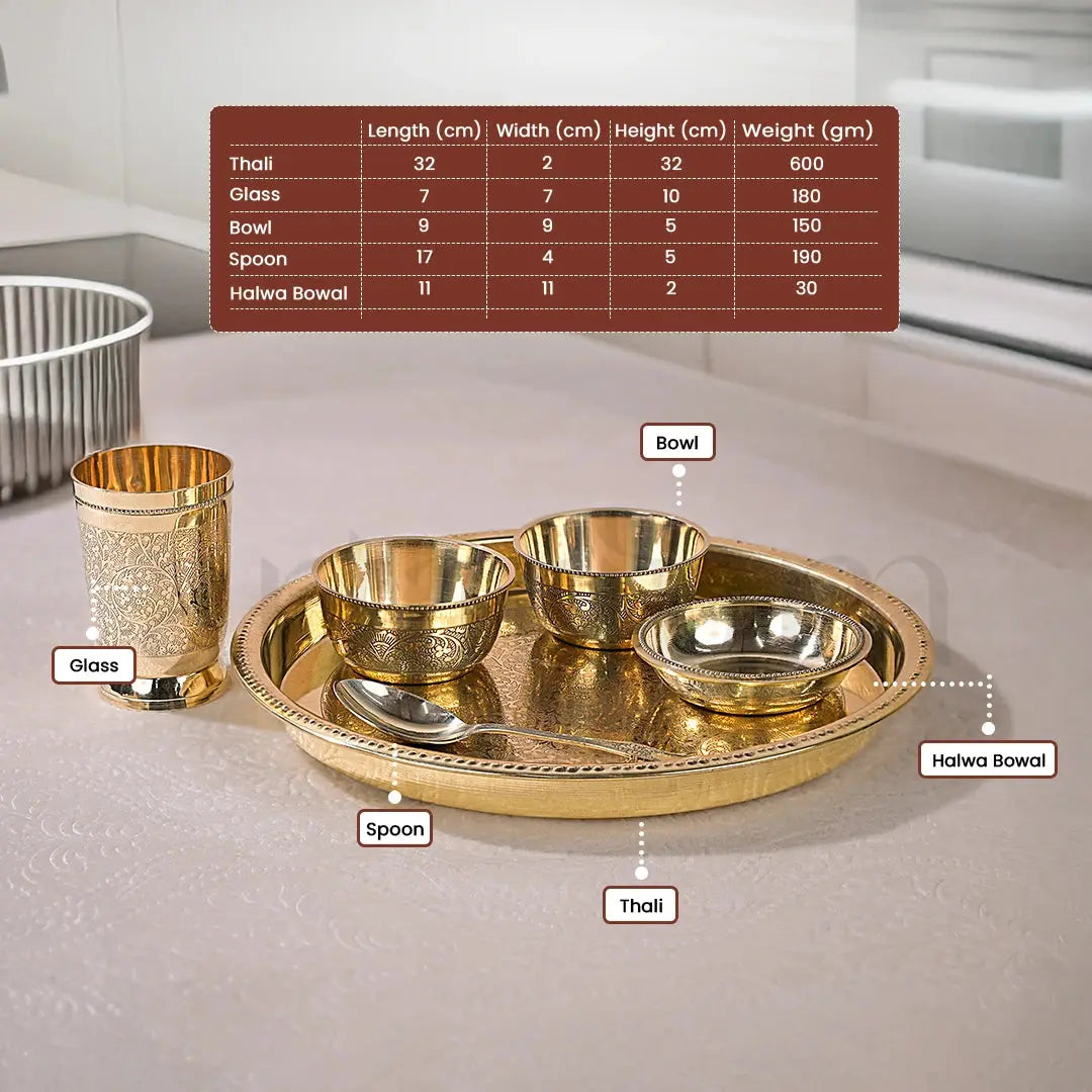 Add a touch of tradition to your dining experience with this Brass Etching Dana Thali Set. This beautifully crafted set, featuring intricate etchings is perfect for serving festive meals or hosting guests. This six-piece brass thali set includes everything you need for a complete meal, from thali to a halwa bowl for desserts. Whether you’re using it for your daily meals or festive celebrations, this brass thali set is sure to bring a sophisticated touch to the table.