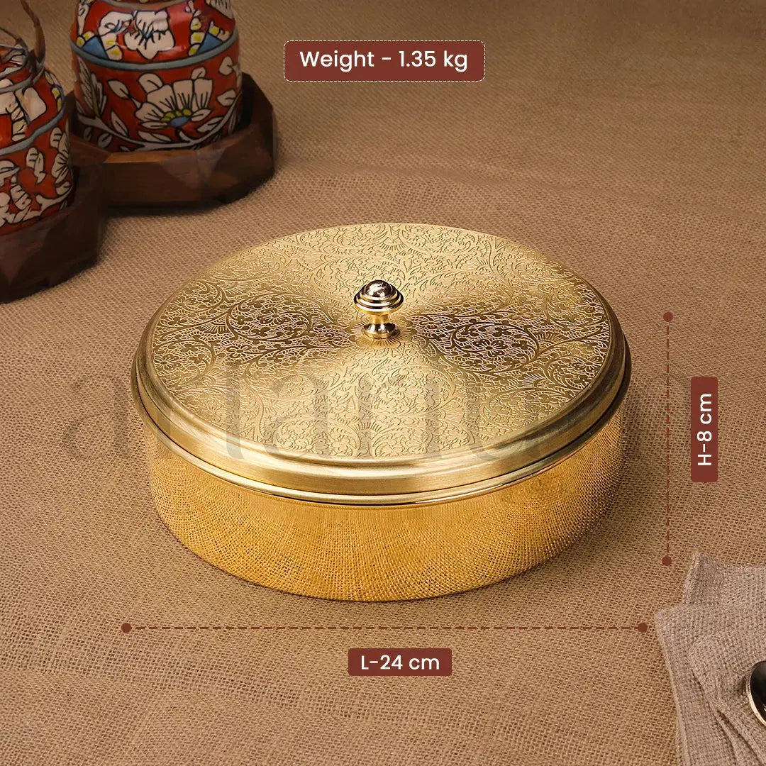 The Brass Spice Box with Spoon is your perfect companion for everyday cooking. Designed with spacious, individual compartments, this masala box is perfect for organizing spices you use daily. The small brass spoon makes it convenient to measure the right amount of spices for all your recipes. Its compact size fits easily on your kitchen counter while the warm, golden hue of brass adds an elegant touch to your cooking space.