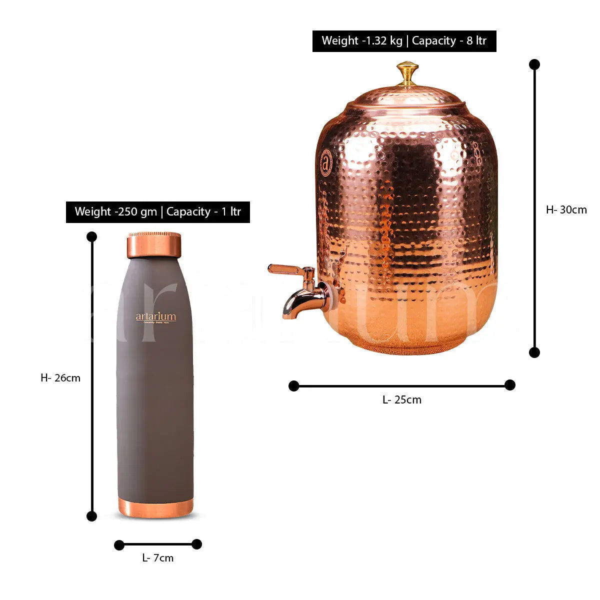 Featuring our Antique Copper Water Dispenser with Lid (8 litres) and Eco-Friendly Copper Water Bottle (1 liter), each drinkware in this set is detailed by hand and crafted to elevate your hydration experience. The dispenser’s generous 8-litre capacity makes it perfect for daily use or festive gatherings, while the 1-litre bottle ensures you stay hydrated wherever you go.