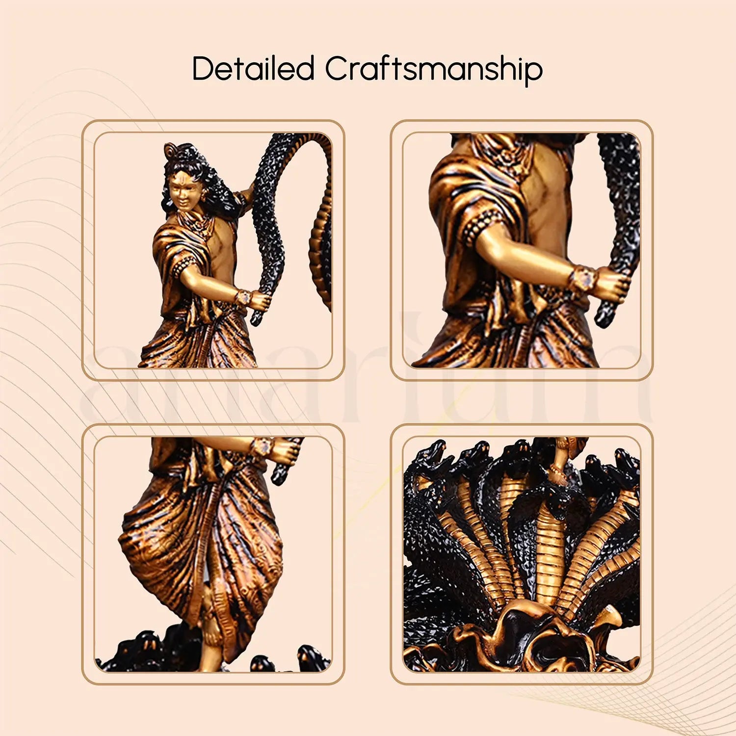 Dancing Krishna is a beautifully crafted idol that captures the iconic moment from Hindu mythology when Lord Krishna overpowered the venomous serpent, Kaliya Naag, with his divine powers. Handcrafted with intricate detailing, the idol depicts Lord Krishna in his youthful form, dancing atop the defeated serpent, Kaliya. The grace of Krishna's posture and the coiled tension of the serpent are brought to life with sleek precision, making this piece a true work of art. Bring home this divine representation of Lord Krishna's victory over the forces of darkness and invite peace and prosperity into your life.