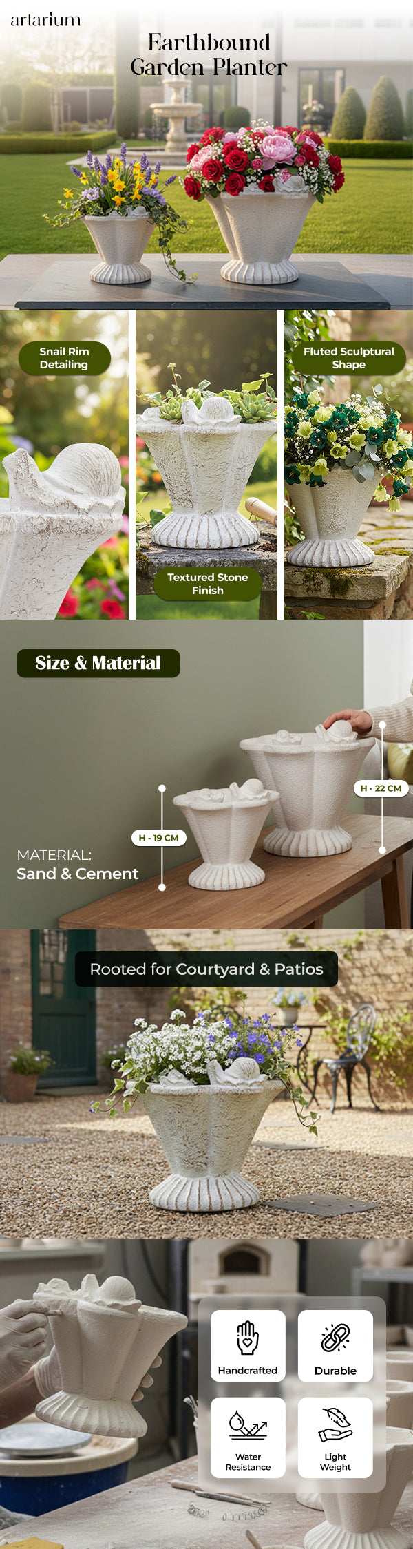 Snails trail gently across its rim, giving this garden planter, coined Earthbound, its whimsical character. Crafted with premium quality materials, and featuring ridged contours and a textured finish, it complements everything from mossy greens to trailing vines. Perfect for those who appreciate a touch of personality in their living space.