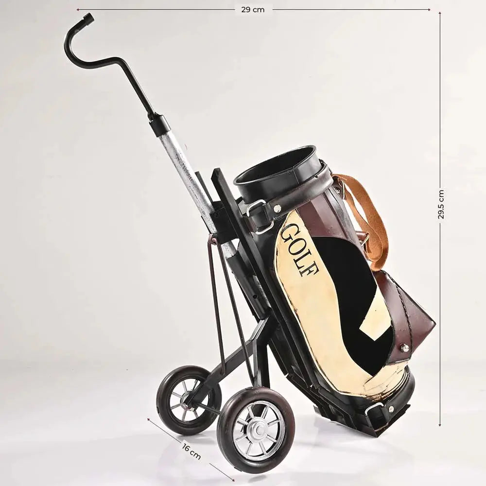 Inspired by the classic golf bags from yesteryear, this Fairplay golf cart bag features intricate details like the leather-like straps, realistic wheels, and a sturdy handle, all crafted from high-quality metal. The aged finish adds a touch of rustic charm, evoking the feel of well-loved and well-used golf gear.