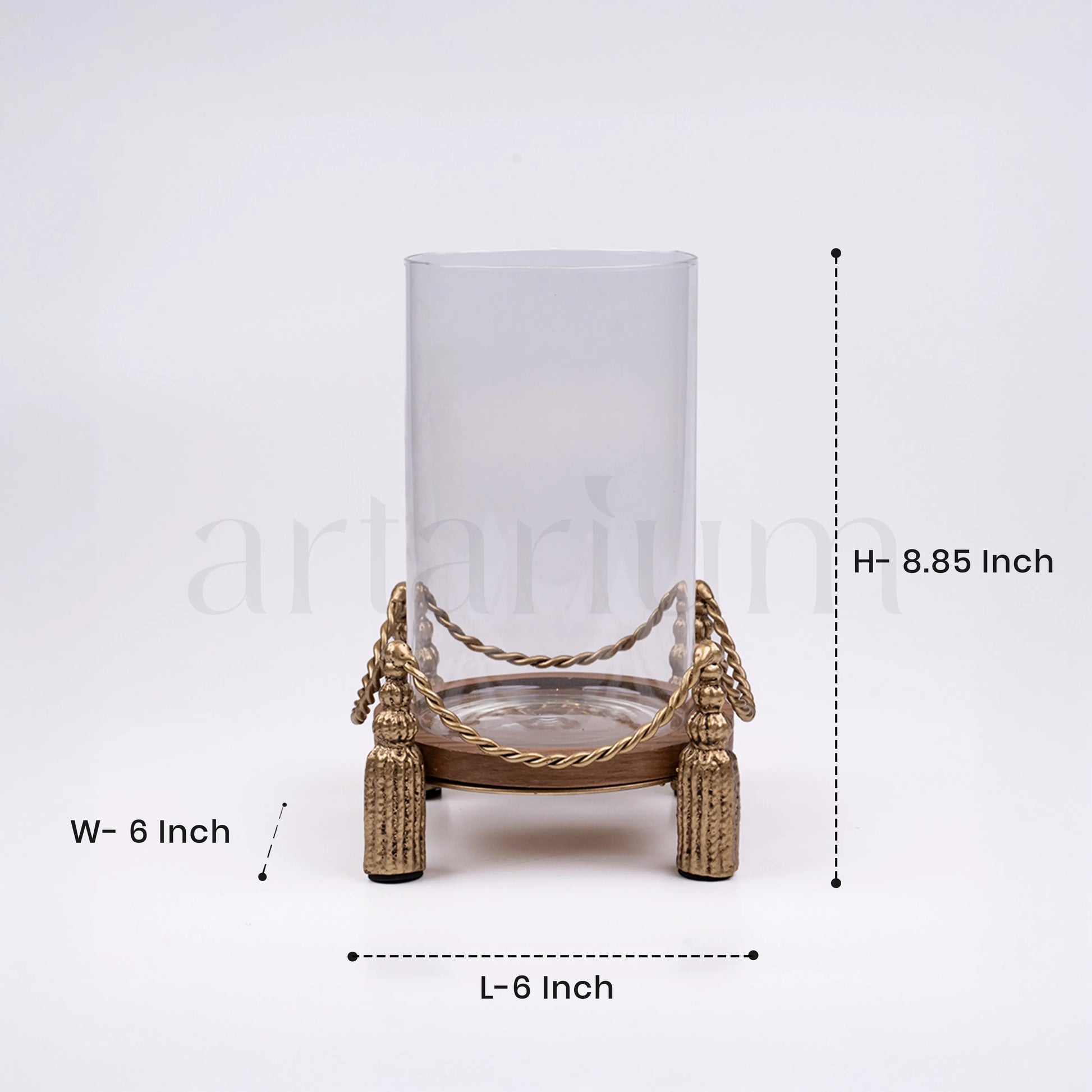 Elevate your ambiance with this vintage hurricane candle holder coined Flamekissed for its majestic charm. Featuring a classic glass cylinder perched atop a wooden base detailed with ornate golden tassels and twisted rope accents, this piece brings a regal, old-world charm to any space. Cast a warm, inviting glow to any space with this statement candle holder.
