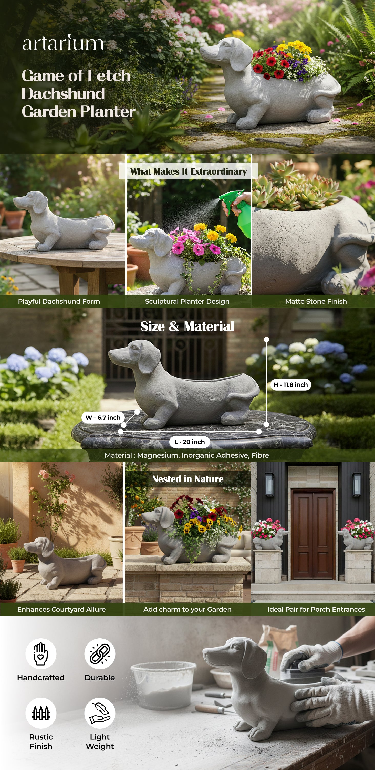 Charming and full of personality, Game of Fetch brings whimsy to your garden or balcony. Shaped like a playful dachshund, this sculptural planter adds a quirky touch to your greenspace. Crafted from a blend of premium-quality materials, it’s as durable as it is delightful. Dachshunds, known for their loyalty and spirit, symbolize courage and companionship - making this piece both ornamental and meaningful.