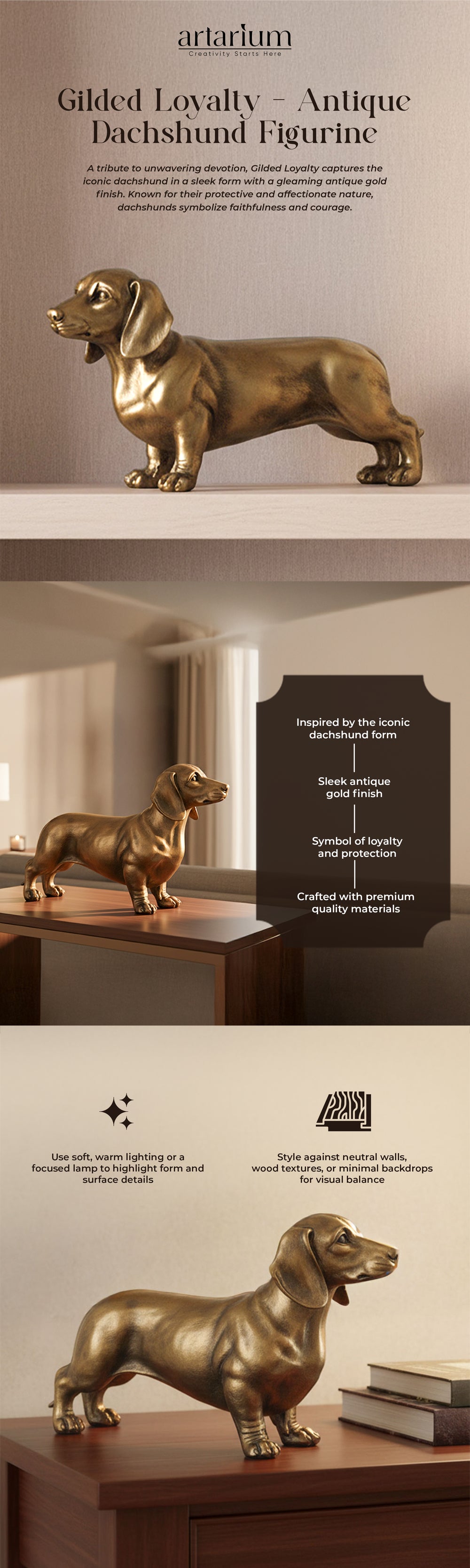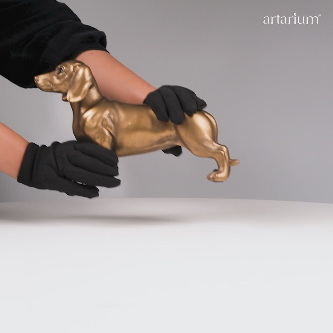 A tribute to unwavering devotion, Gilded Loyalty captures the iconic dachshund in a sleek form with a gleaming antique gold finish. Known for their protective and affectionate nature, dachshunds symbolize faithfulness and courage. This elegant figurine is a subtle nod to companionship and makes a charming addition to bookshelves, centre tables, or entryway consoles.