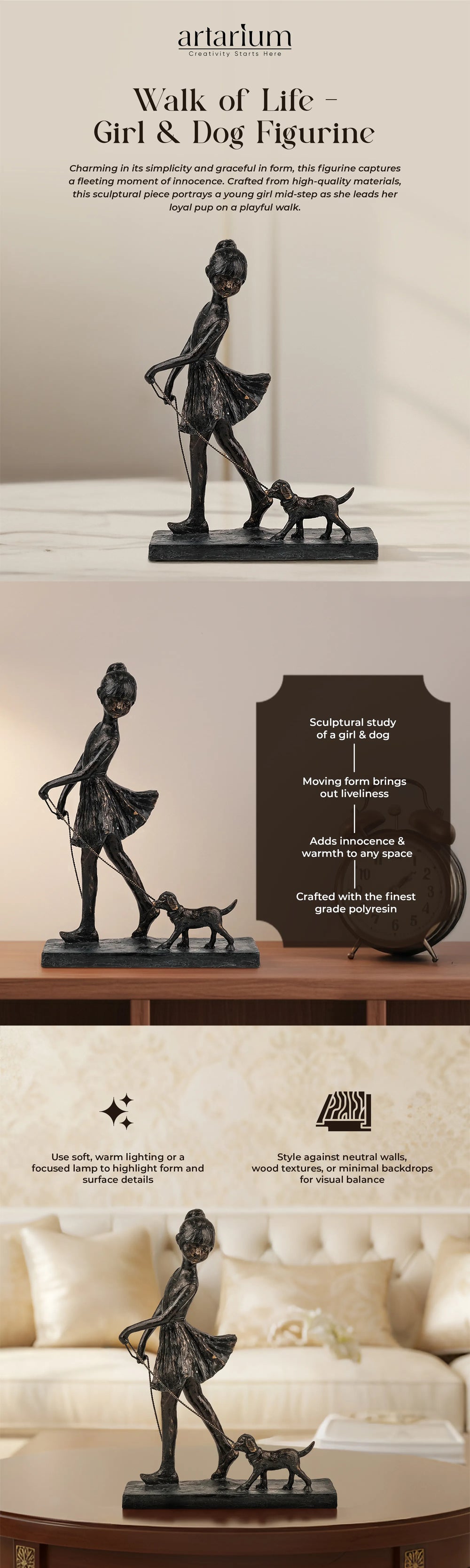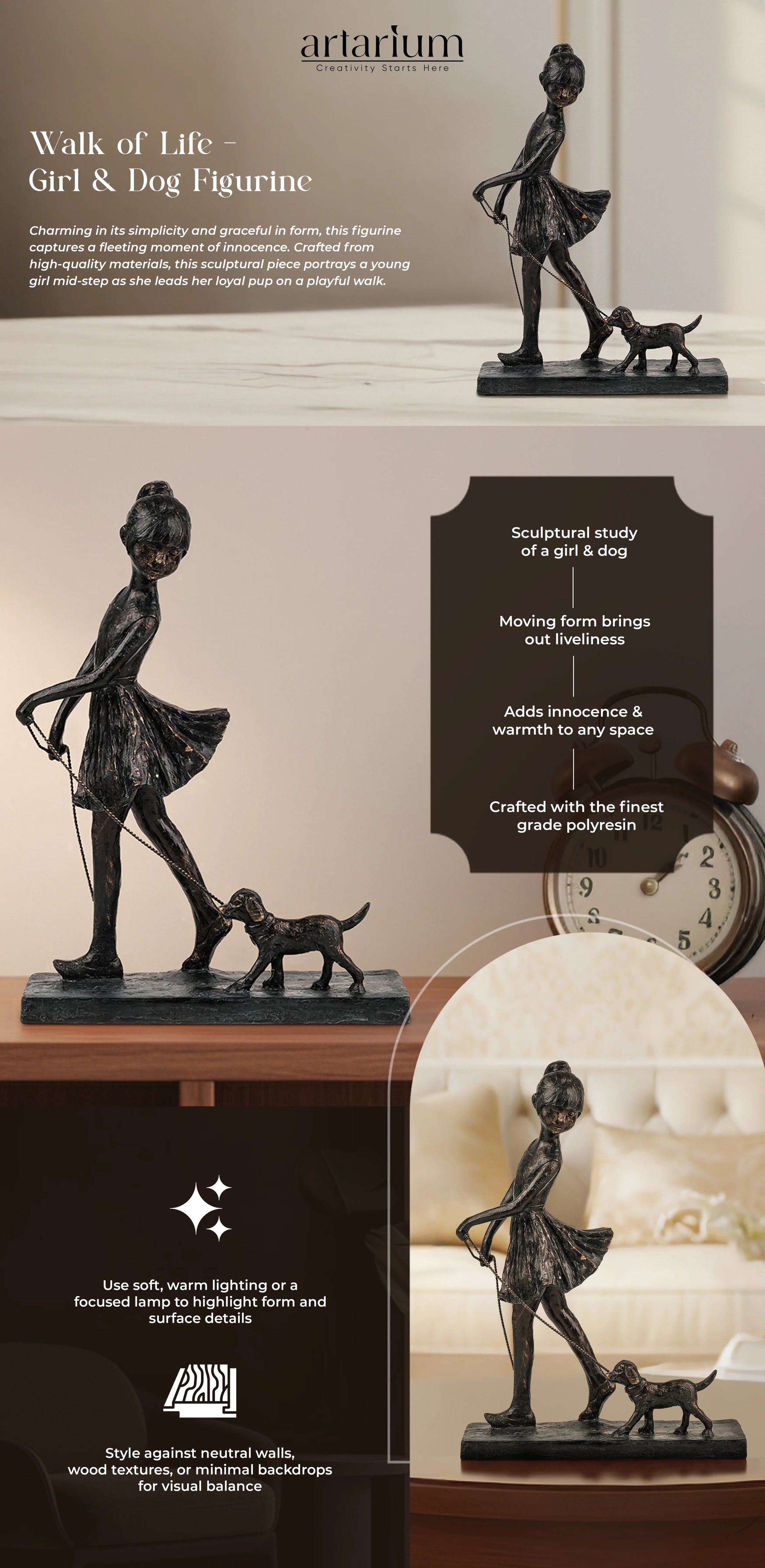 Charming in its simplicity and graceful in form, this figurine captures a fleeting moment of innocence. Crafted from high-quality materials, this sculptural piece portrays a young girl mid-step as she leads her loyal pup on a playful walk. The composition balances whimsy with elegance, making it a timeless accent for refined interiors. Whether placed on a mantel, bookshelf, or curated tabletop, this figurine brings warmth, movement, and nostalgic charm to any space.