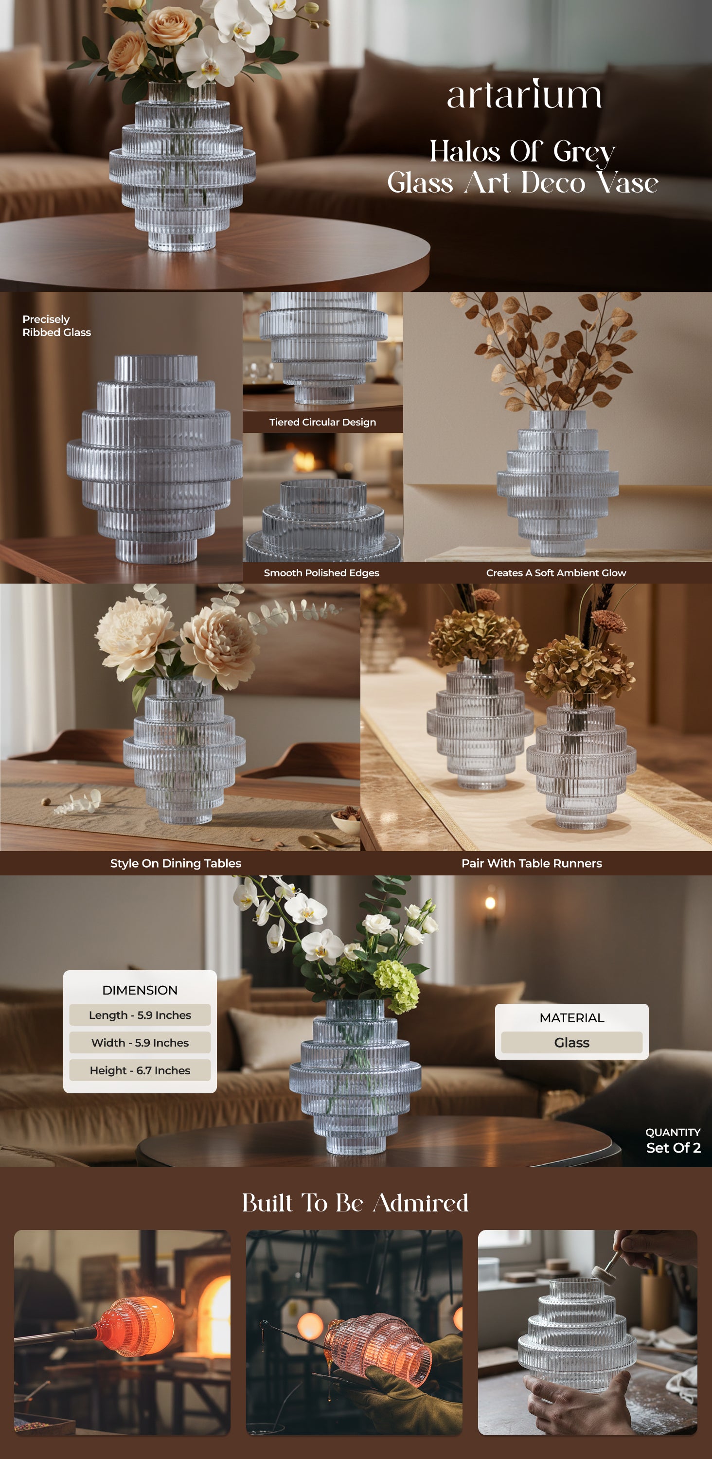 A celebration of sculptural form and vintage flair, Halos of Grey is an Art Deco-inspired glass vase set - a bold addition to any modern curated space. With a chandelier-like tiered silhouette and textured vertical ribbing, it evokes the glamour of the Jazz Age while offering a contemporary feel. Whether styled with florals or left unadorned, this set of two vases commands attention as functional & statement art.