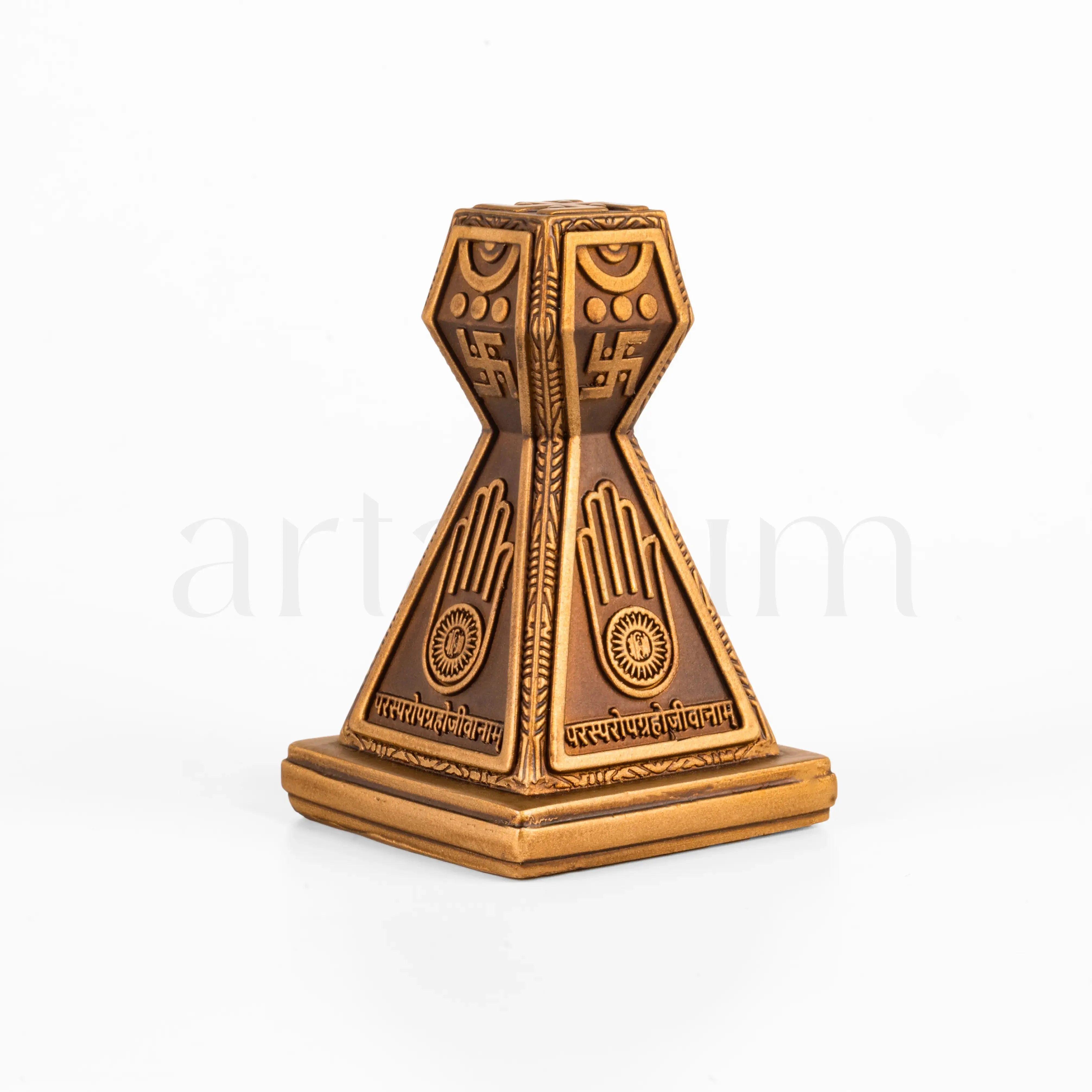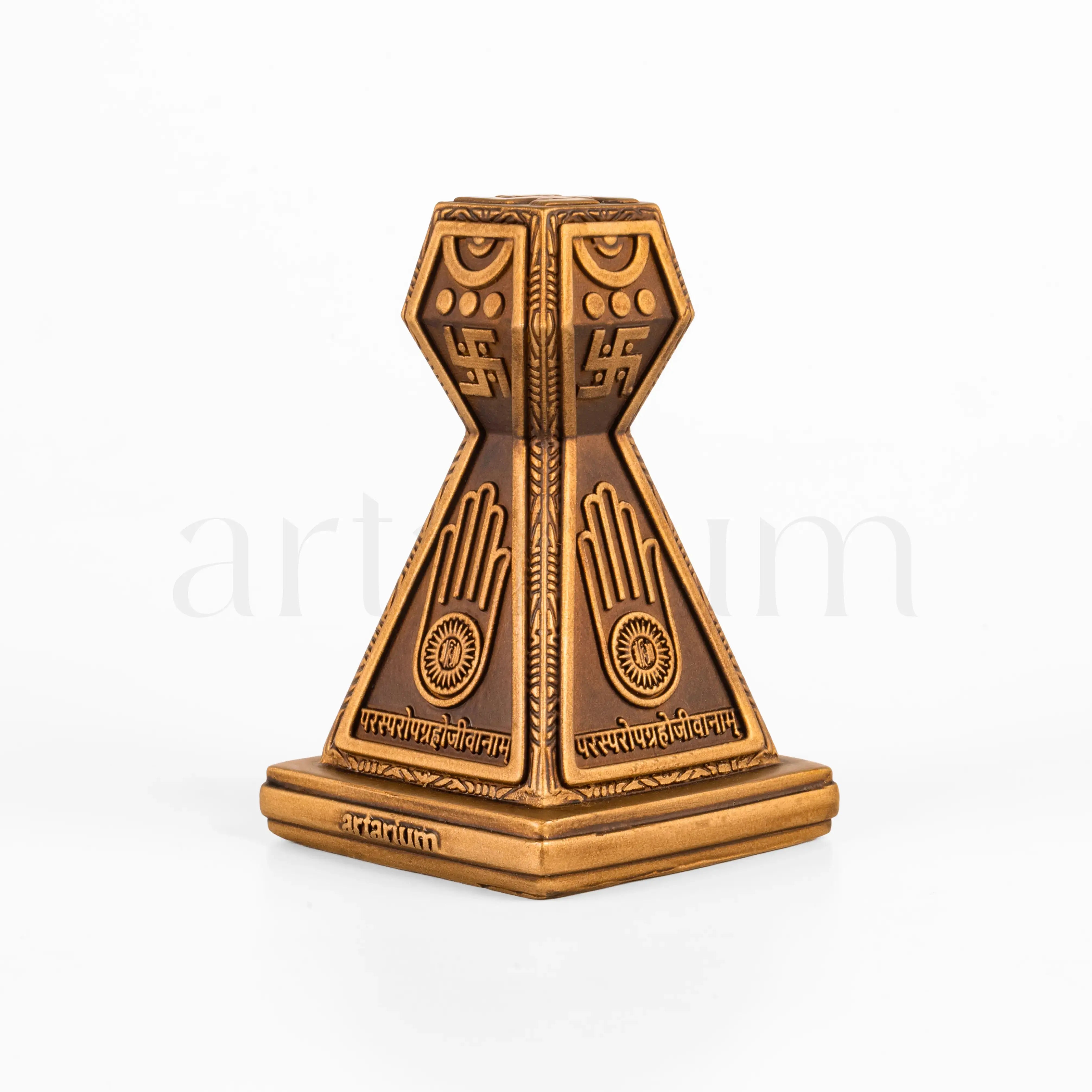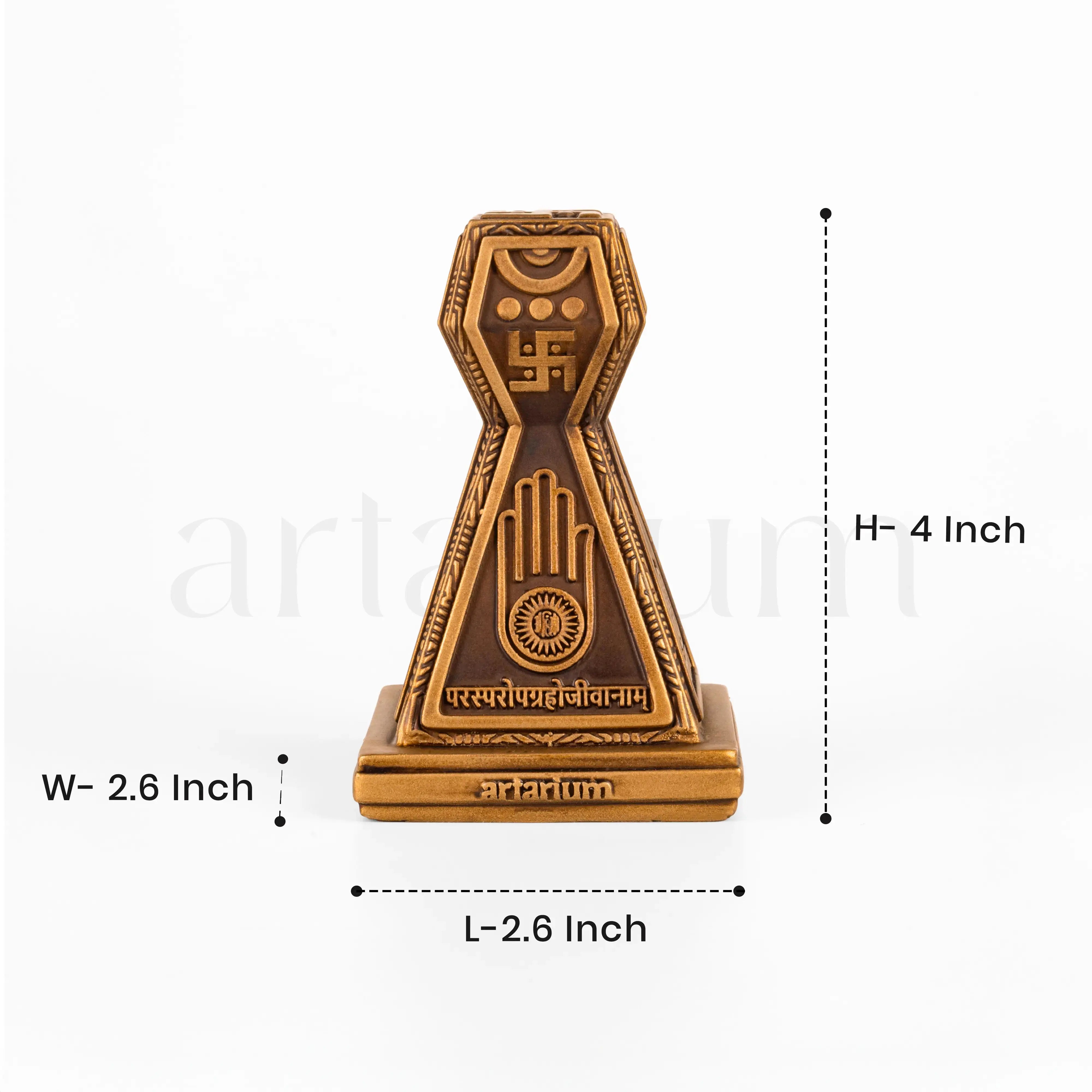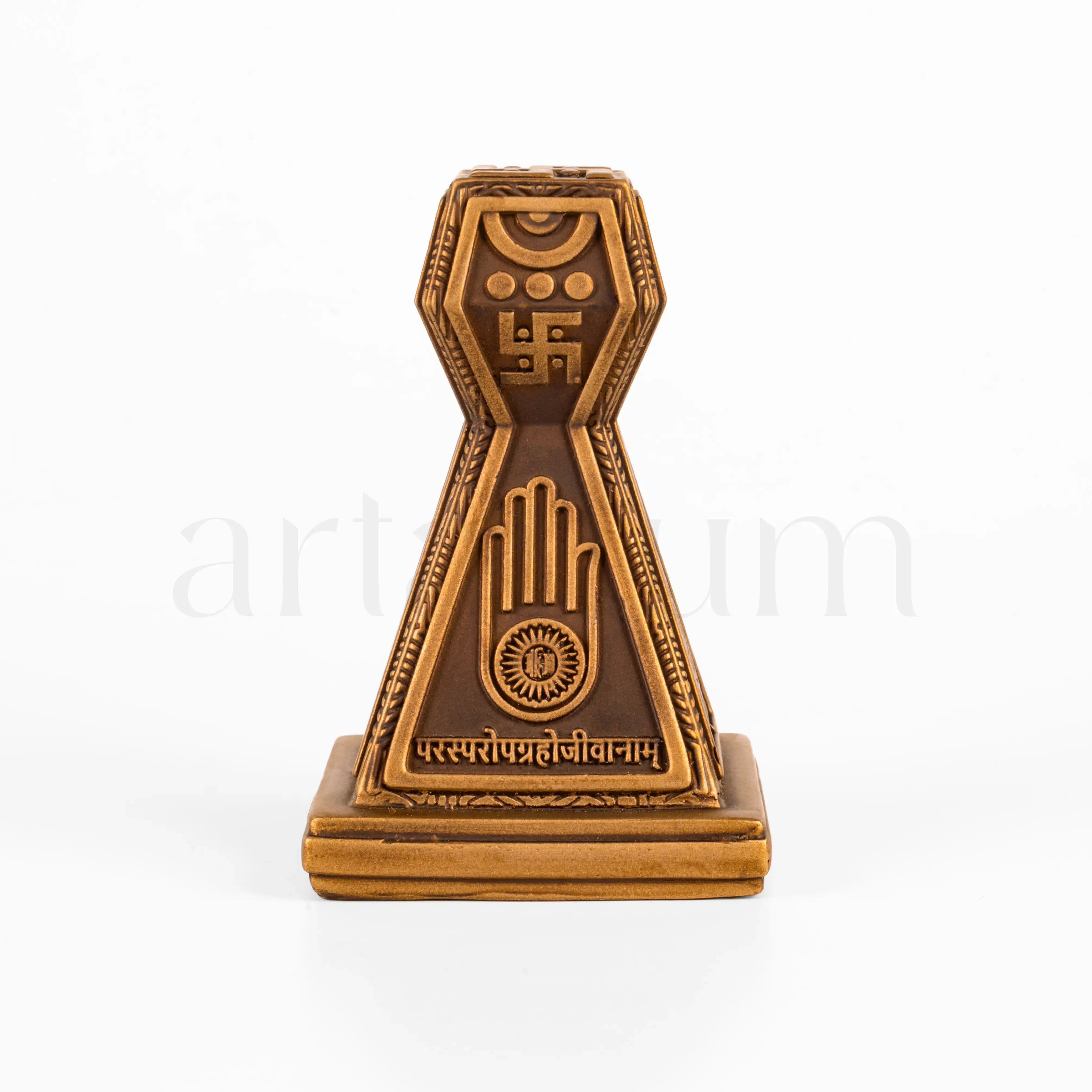 The Jain Symbol Figurine beautifully captures the tenets of Jain philosophy in all its nuances. Every detail holds meaning, from the sacred hand of blessings bearing the wheel of Ahimsa, to the Swastik symbol embodying the four states of existence, and the guiding mantra of liberation at the bottom, a reminder that all life is bound together by mutual support and interdependence.