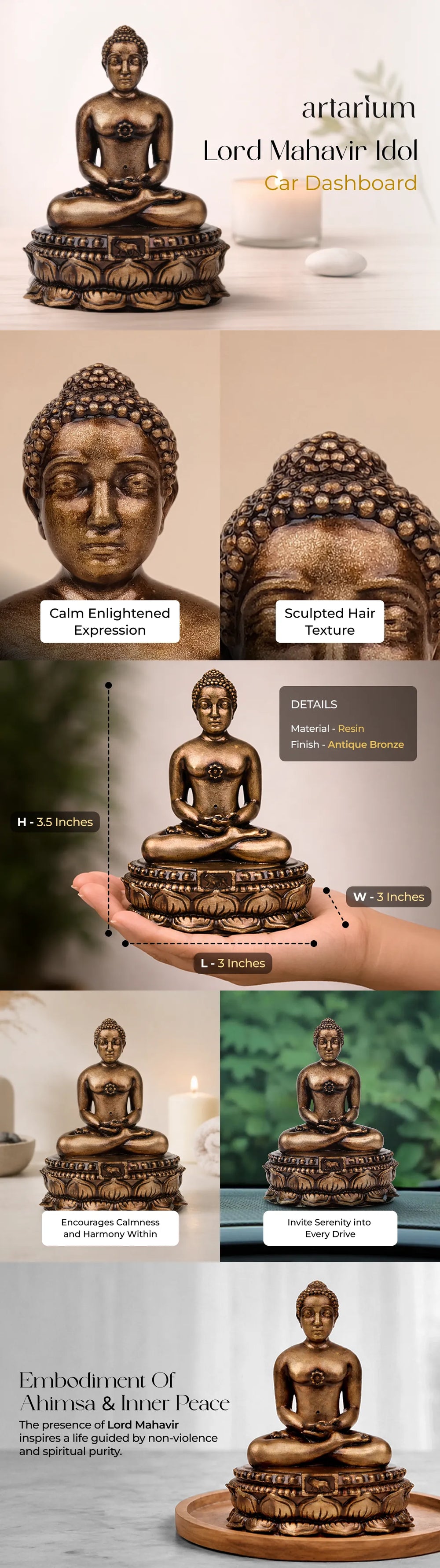 Bring peace and positivity to every journey with the Artarium Lord Mahavir Car Dashboard Idol. This beautifully crafted idol shows Lord Mahavir seated in a calm meditation posture (Padmasana), symbolizing peace, wisdom, and inner balance. His serene face, straight posture, and folded hands in Dhyana Mudra reflect deep meditation and spiritual awakening. The finely detailed lotus base adds elegance and stability, making it perfect for your car dashboard.
