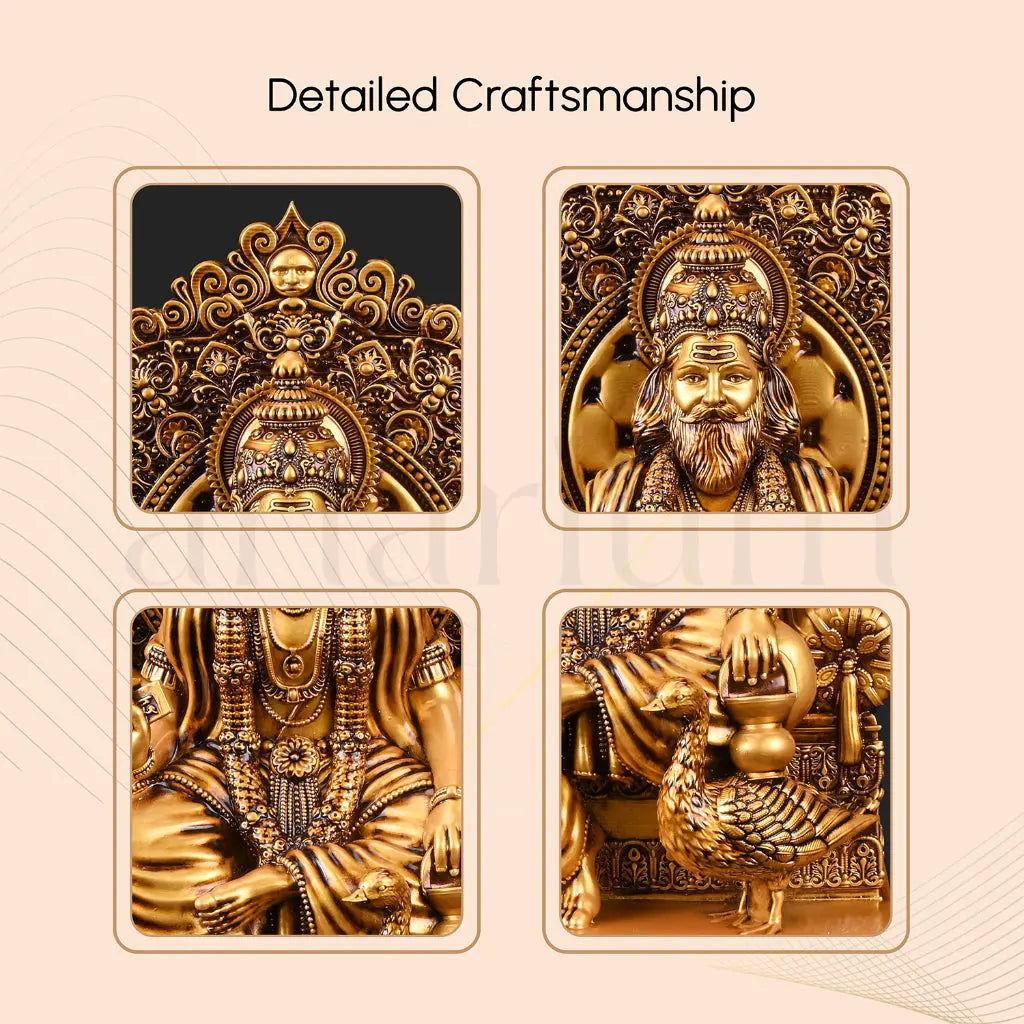 The beautifully handcrafted Lord Vishwakarma Murti, a stunning representation of the Hindu god of creation, craftsmen, and architects. This exquisite god idol showcases Lord Vishwakarma seated gracefully on a royal throne, adorned with a majestic crown, garlands, and a mala. Each detail, from the water-pot, book, noose, and measuring tape in his hands to his white beard, is intricately crafted by skilled artisans. Accompanied by his faithful vahana, the hamsa (swan), this idol is designed in an antique finish, adding a timeless elegance to any space. Perfect for your home, office, or sacred space, this idol brings positive energy, creativity, and craftsmanship blessings. Upgrade your decor with this divine symbol of prosperity and wisdom.