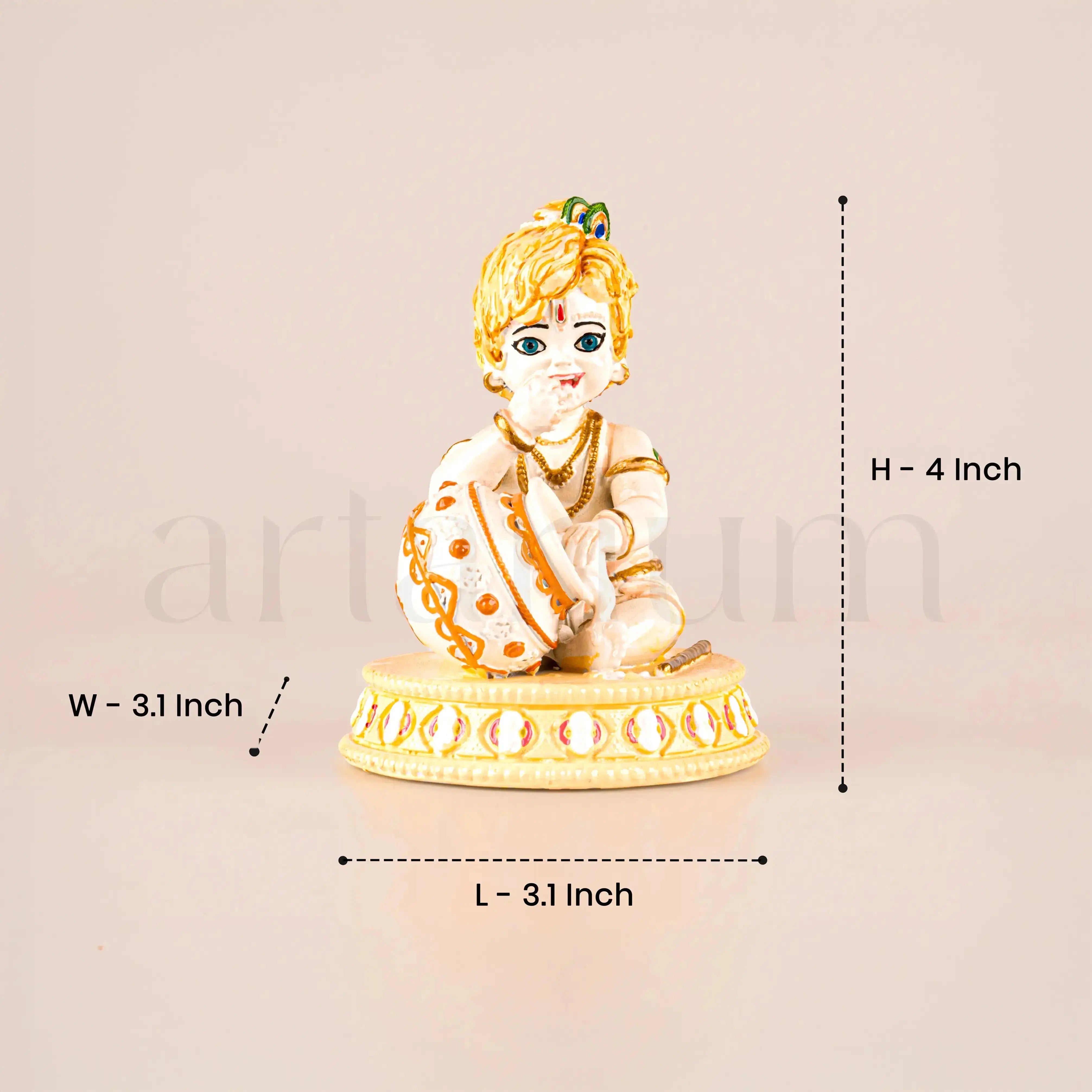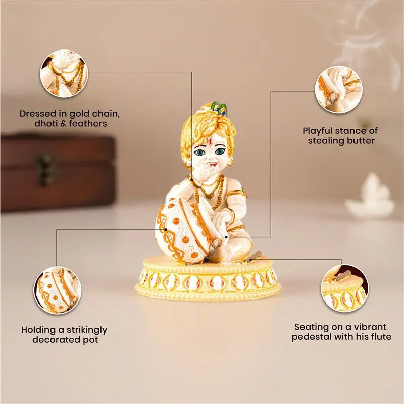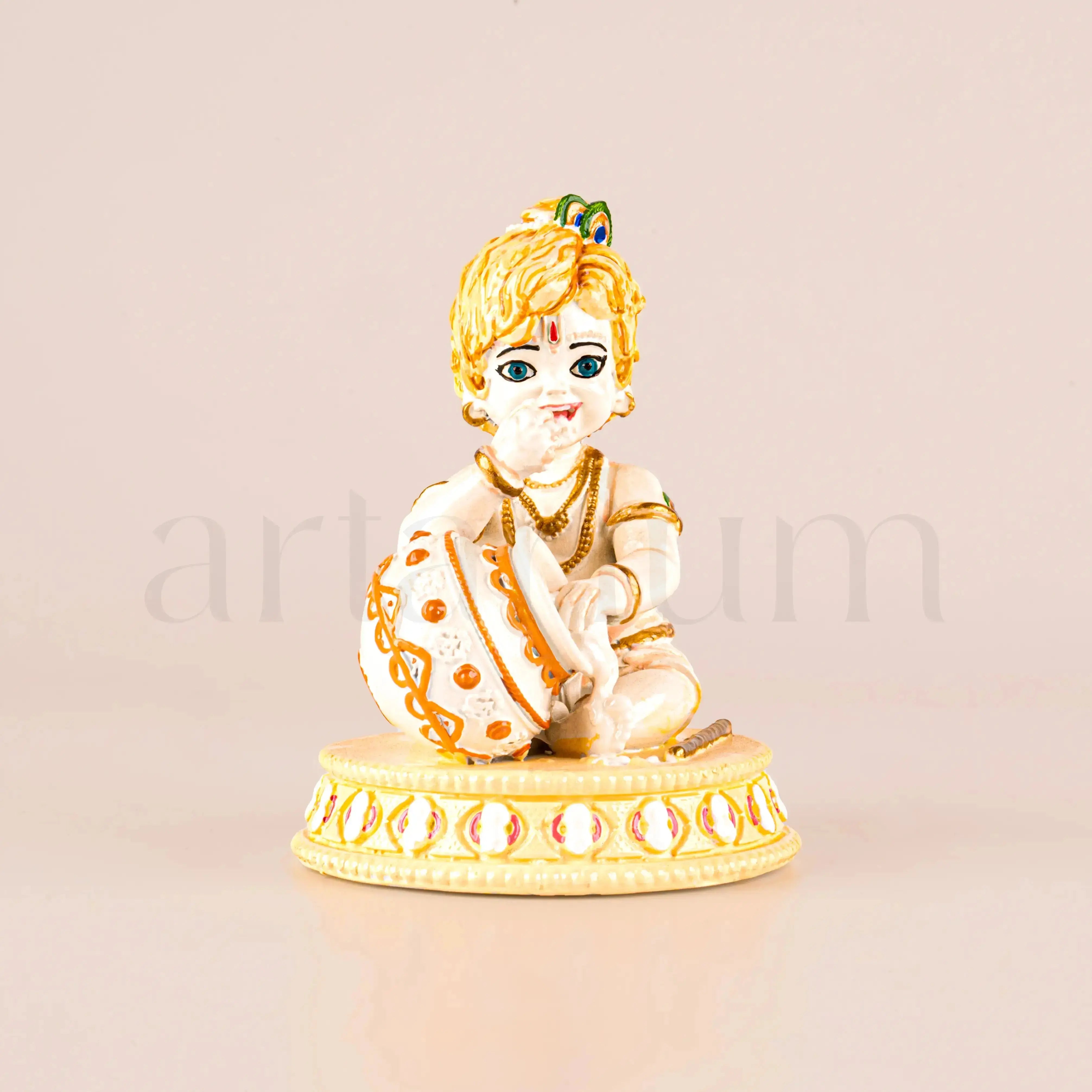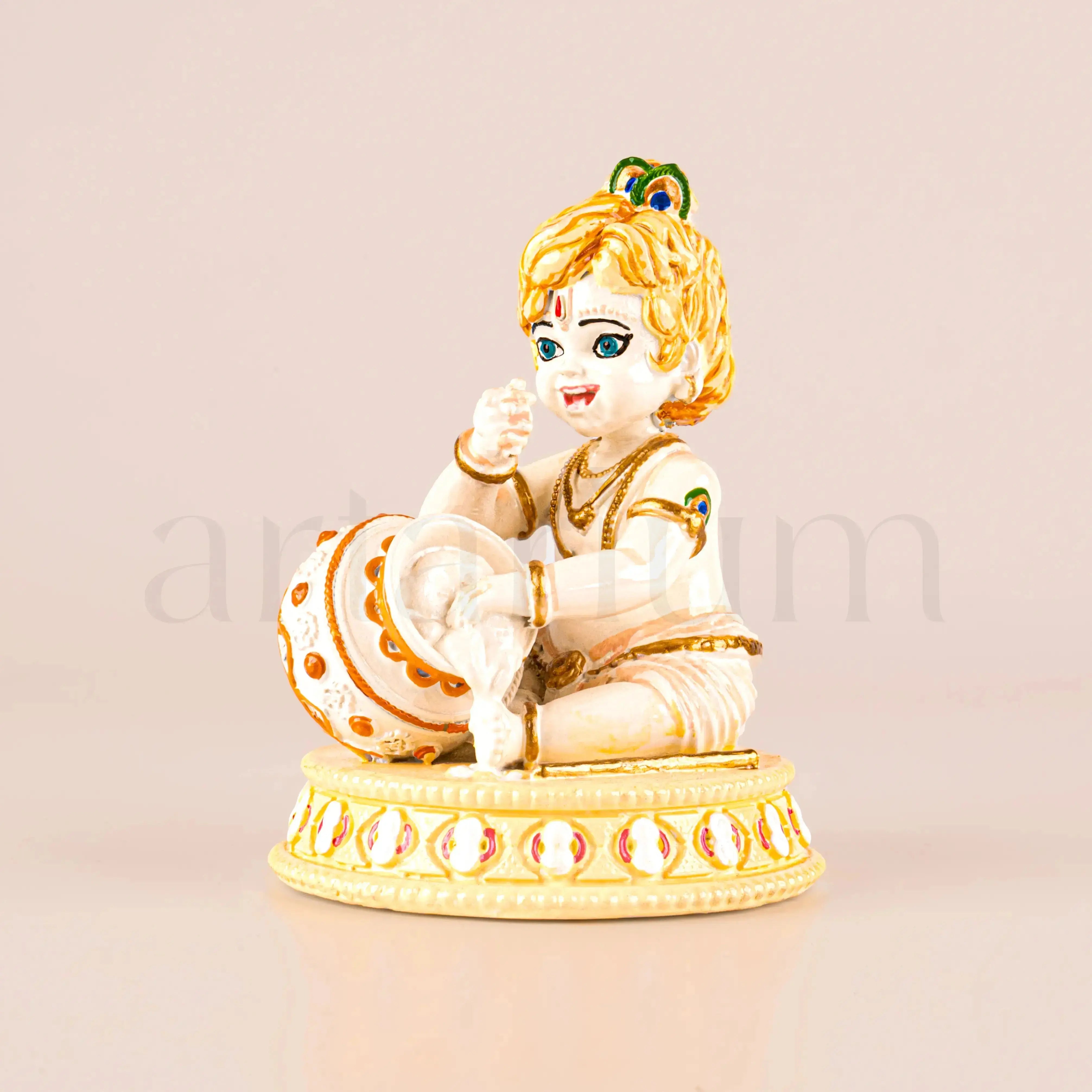 This vibrant figurine captures the true essence of Lord Krishna as a child - playful and endearingly mischievous. Sitting on a beautiful platform with his flute, Bal Gopal (meaning baby Krishna) can be seen gleefully eating a handful of butter from a decorated pot, a habit which earned him the name “Makhan Chor” (butter thief) amongst the villagers. Garbed in his iconic yellow dhoti, with gold chains and two quintessential peacock feathers, this idol is the purest embodiment of Ladoo Gopal’s playfulness and charm.