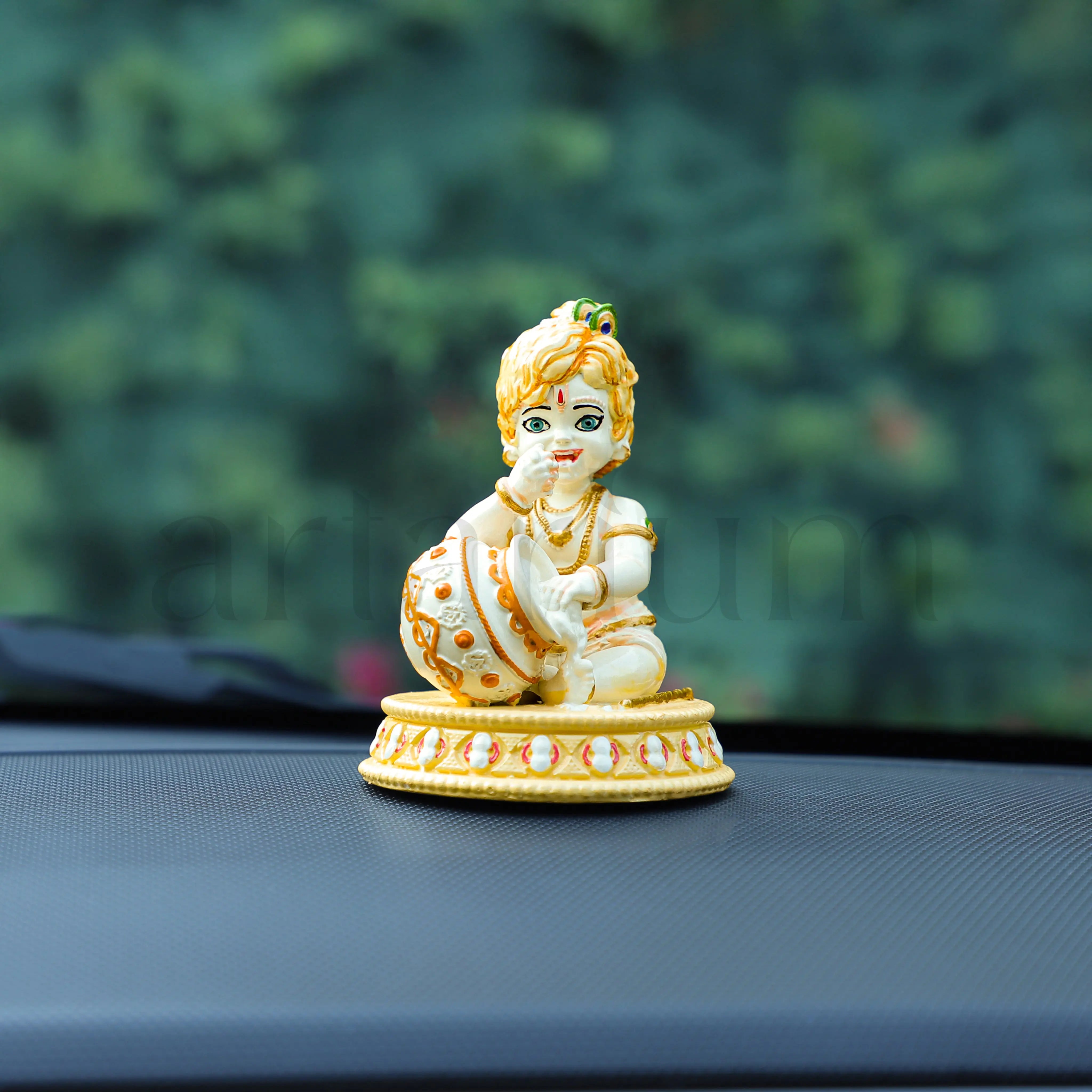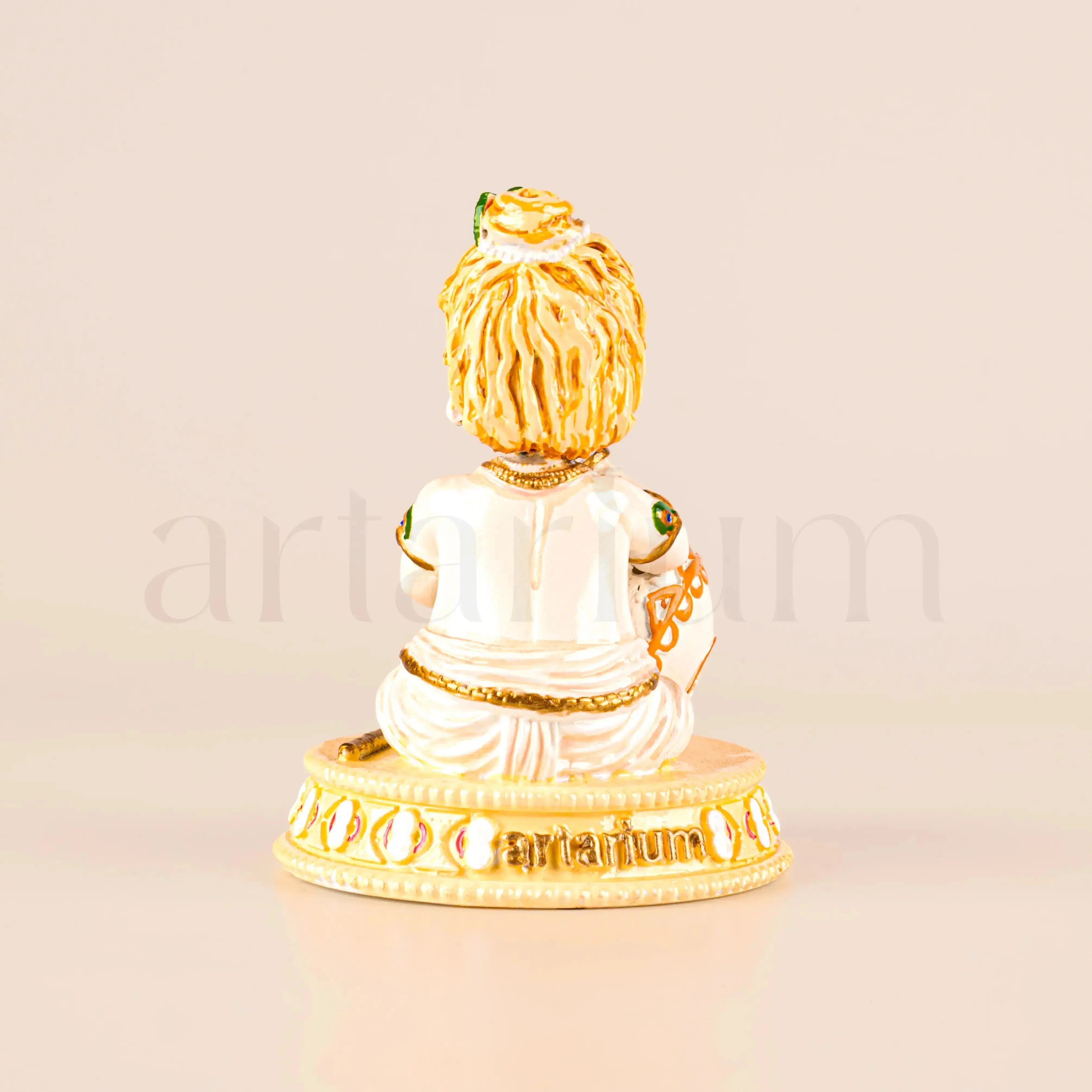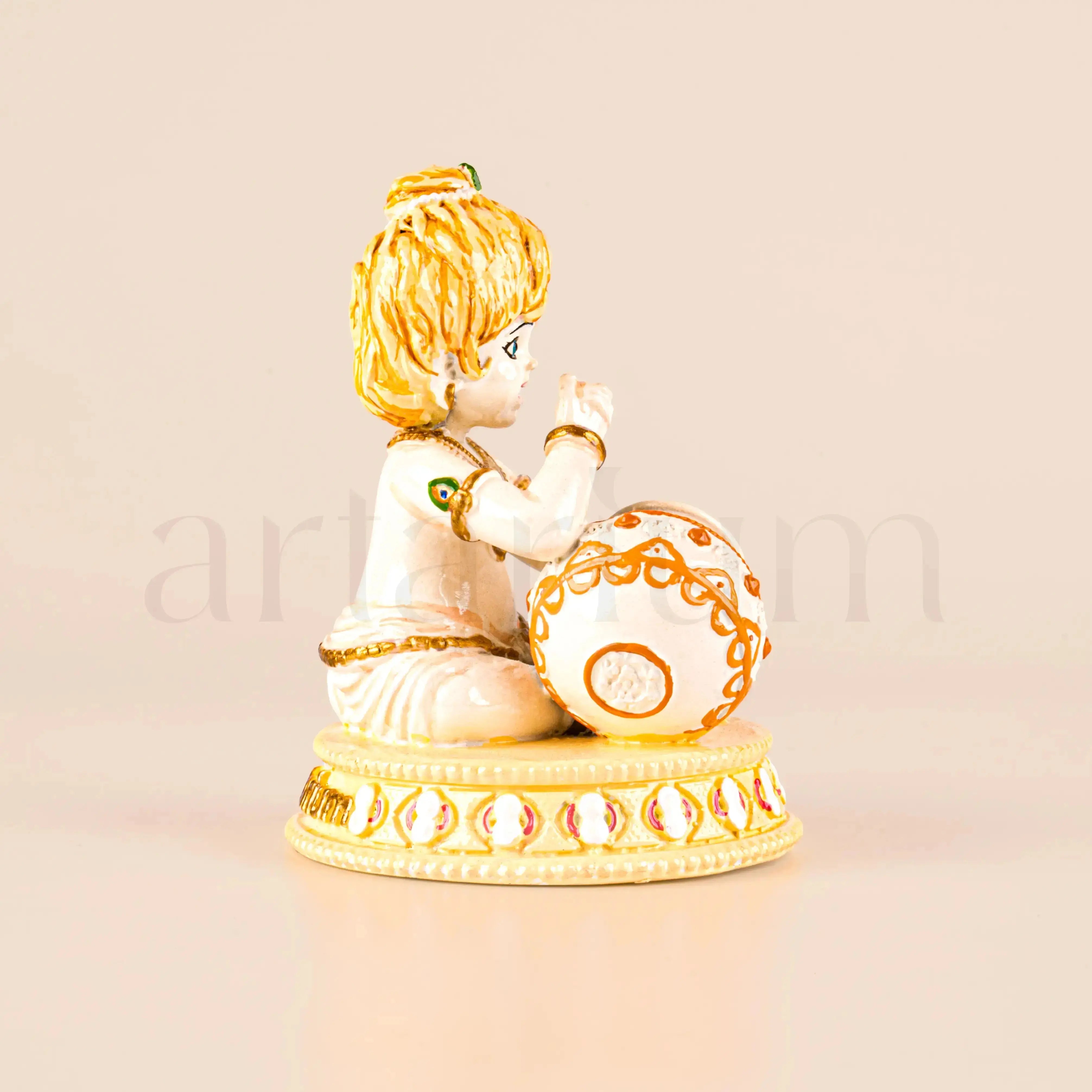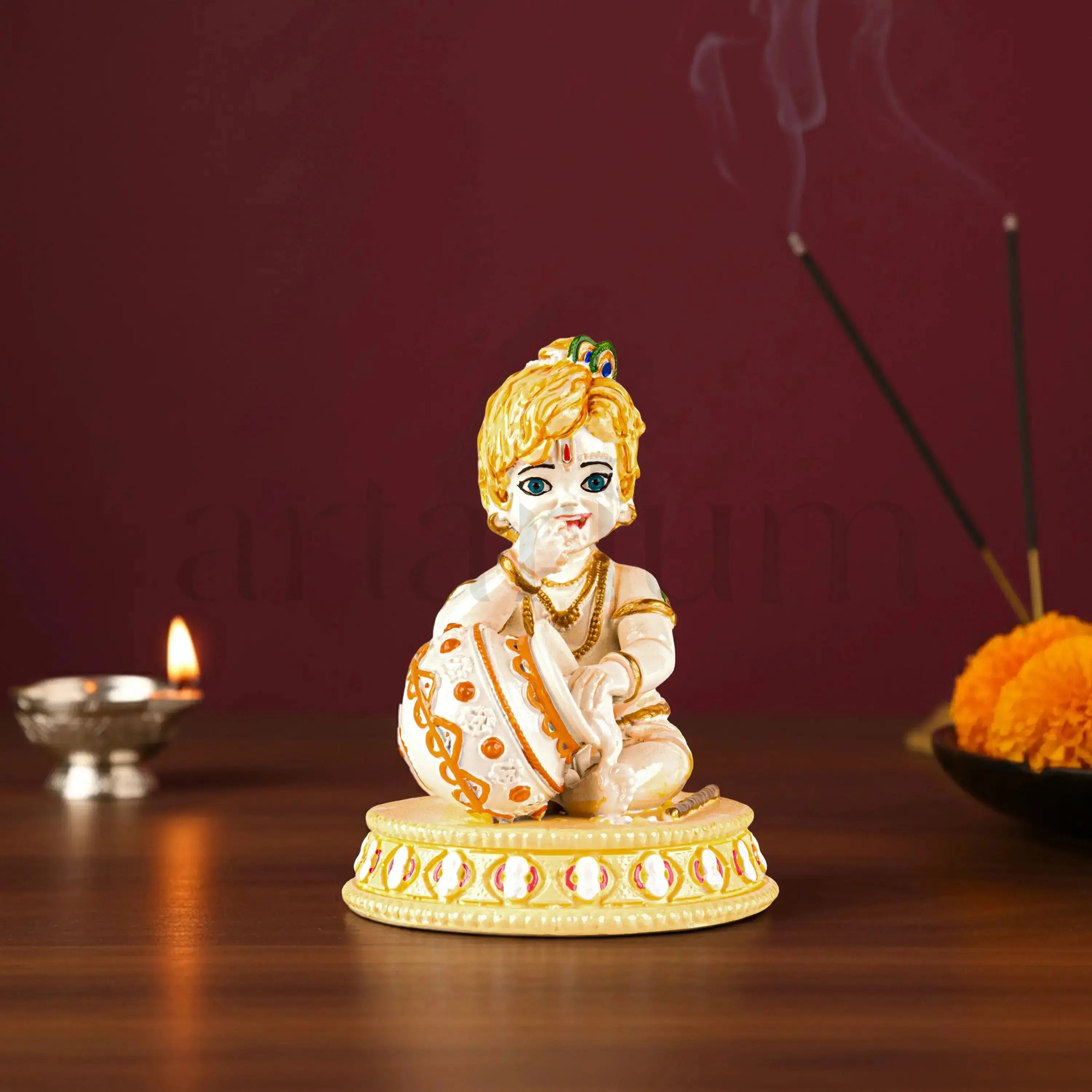 This vibrant figurine captures the true essence of Lord Krishna as a child - playful and endearingly mischievous. Sitting on a beautiful platform with his flute, Bal Gopal (meaning baby Krishna) can be seen gleefully eating a handful of butter from a decorated pot, a habit which earned him the name “Makhan Chor” (butter thief) amongst the villagers. Garbed in his iconic yellow dhoti, with gold chains and two quintessential peacock feathers, this idol is the purest embodiment of Ladoo Gopal’s playfulness and charm.