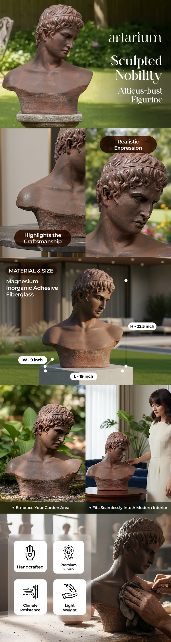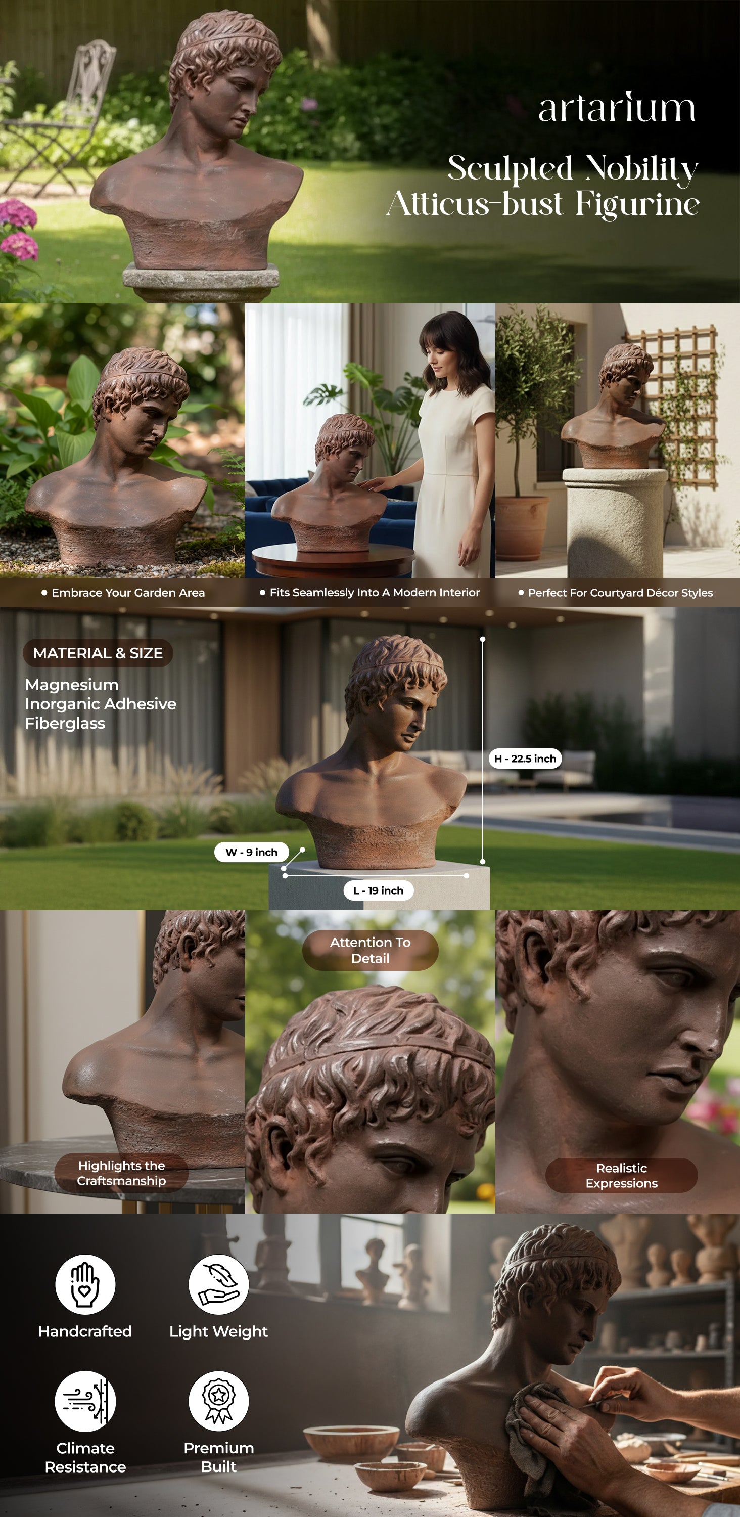 Echoing the serene strength of classical antiquity, this Atticus-bust inspired figurine, coined Sculpted Nobility, captures the quiet dignity of Greco-Roman portraits. Crafted from a blend of premium quality materials, this bust stands as a modern ode to a timeless form. Its bronze-toned surface and tactile base bring textural contrast and unmissable personality to mantels, consoles, or curated shelves.