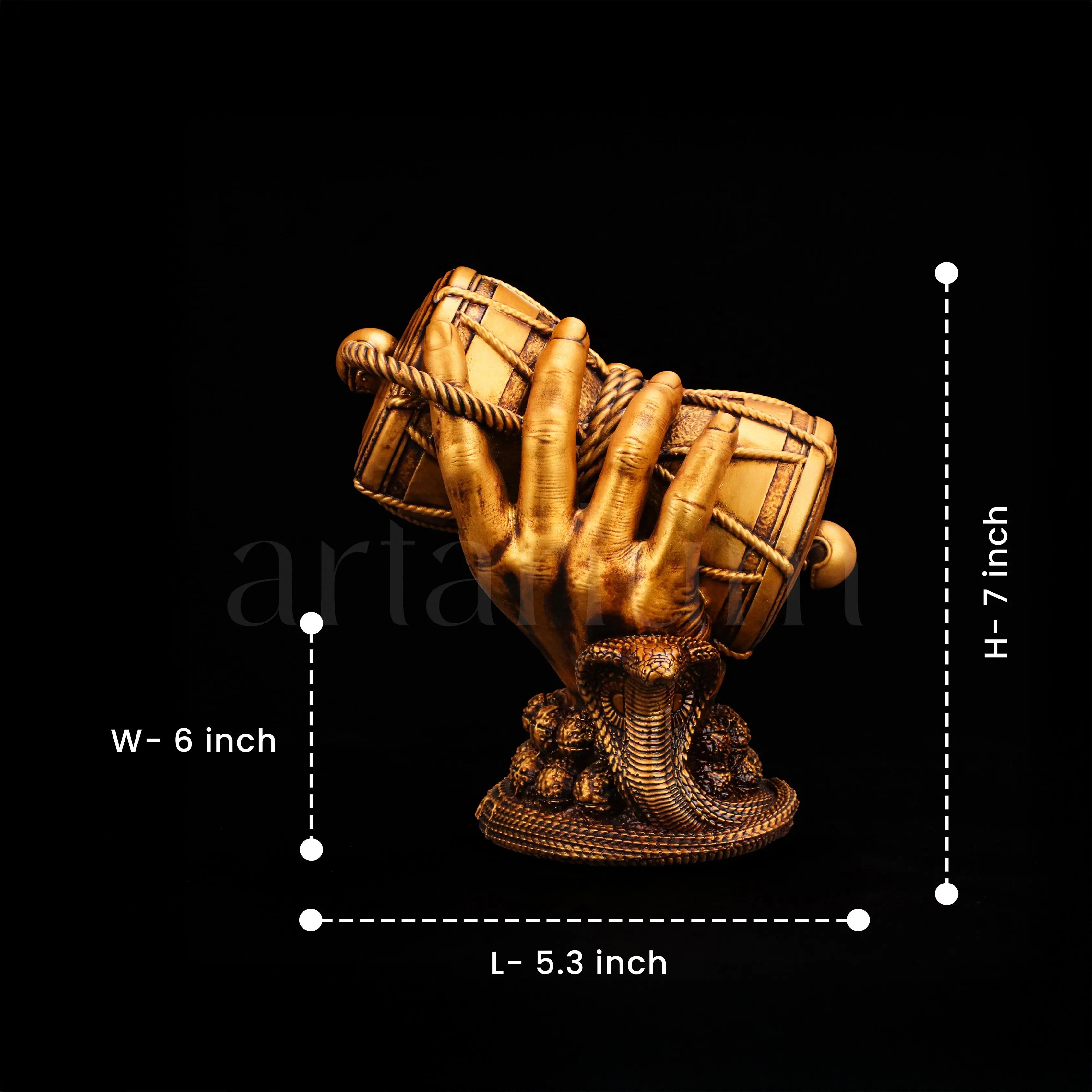 The Shiv Damru idol is a powerful symbol of creation, destruction, and the cosmic rhythm. Depicted in the act of play, the Damru is said to echo the primal sound from which all existence was born. Holding the damru is the hand of Mahadev himself as sacred Rudraksha beads wrap around his wrist along with the Vasuki Naag – the king of serpents.
