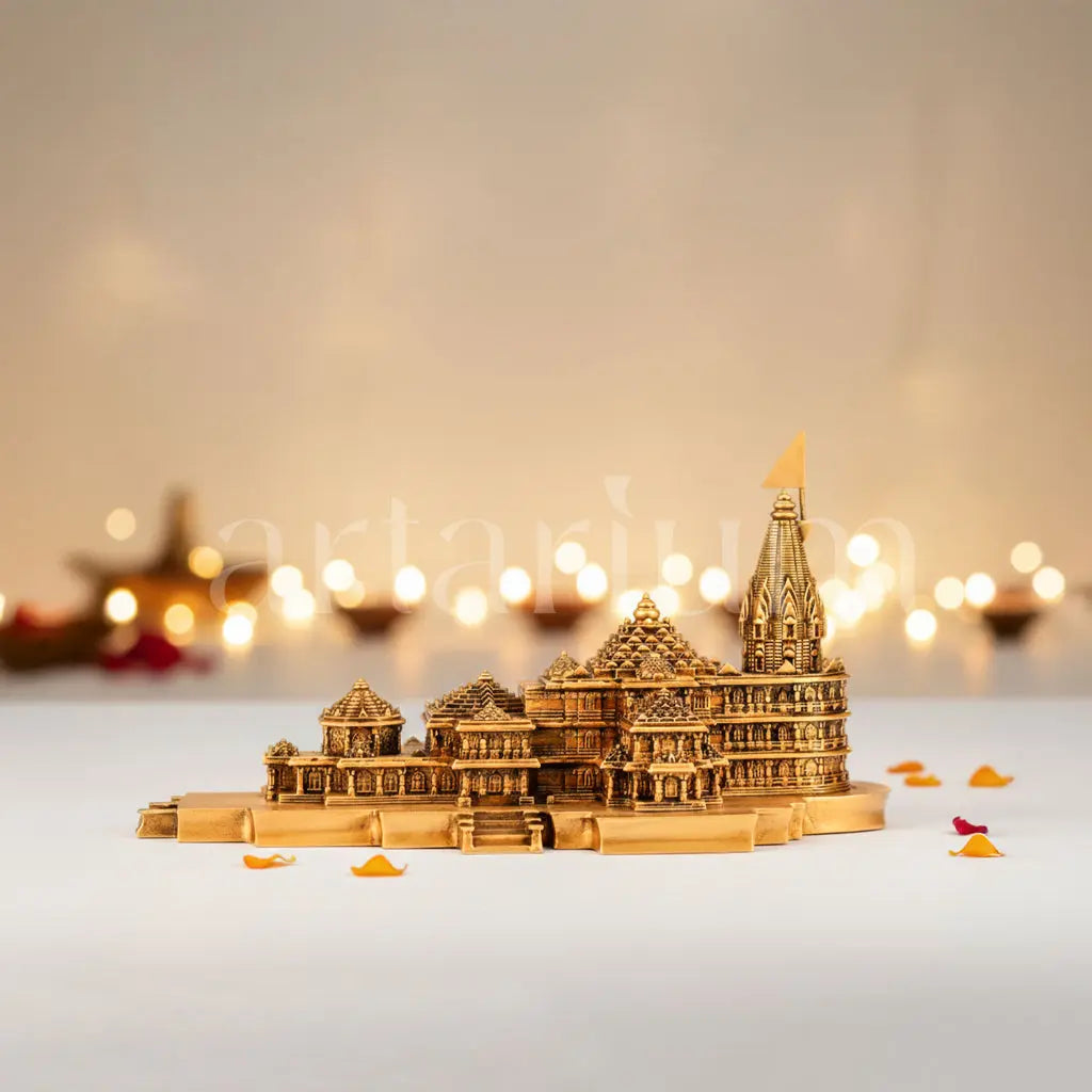 The Shri Ram Murti depicts him in all his divinity, richly adorned, garlanded, and crowned, as he holds his celestial bow while blessing his devotees. Accompanying the idol is the lifelike Ram Mandir murti, capturing beautifully the architectural glory of the iconic temple of Ayodhya.
