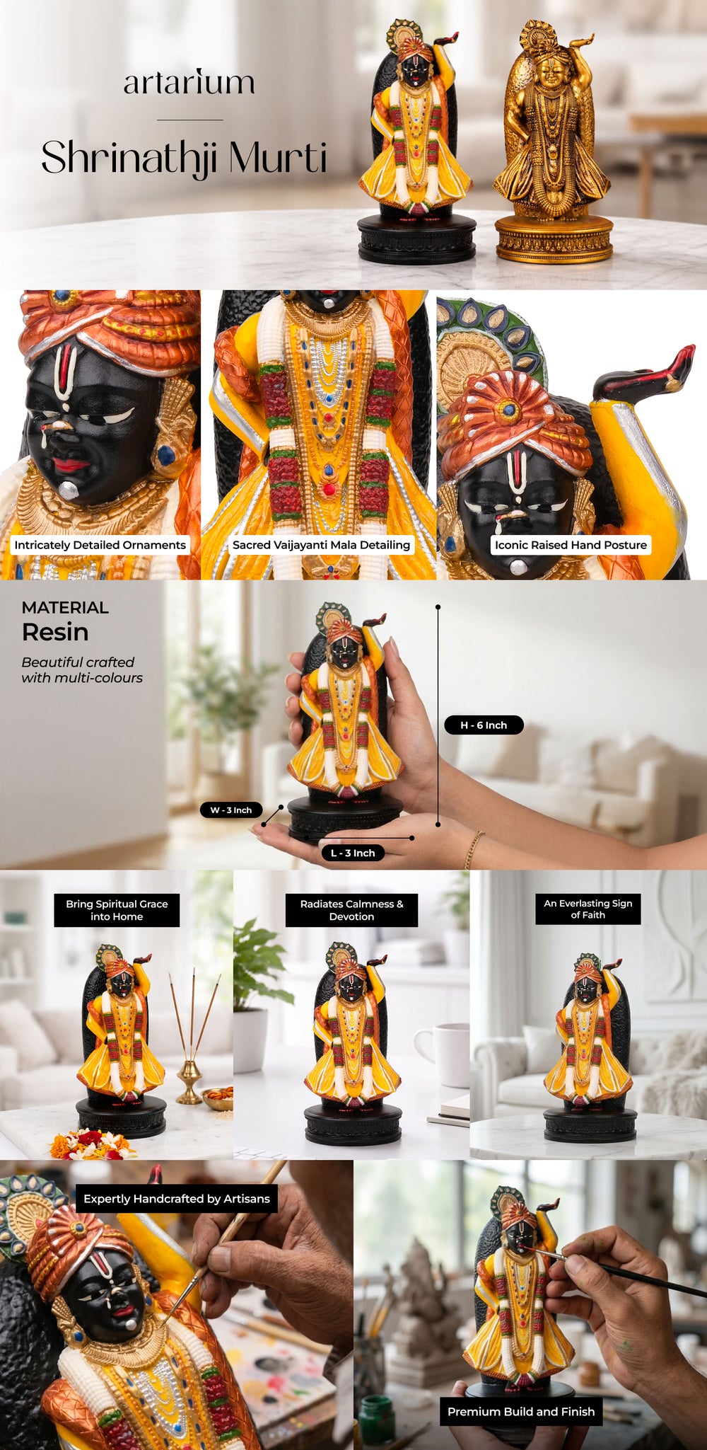 Bring divine grace into your home with this beautifully crafted Shrinath ji murti, a sacred form of Lord Krishna worshipped at Nathdwara. Depicted as a seven-year-old lifting the Govardhan hill to protect the villagers of Vrindavan, Shrinathji is an expression of Lord Krishna and is revered as a symbol of love, protection, and devotion. Intricately designed, this shrinathji murti captures the deity’s serene yet powerful expression, adorned in ornaments, making it a luxurious and auspicious addition to any living space.
