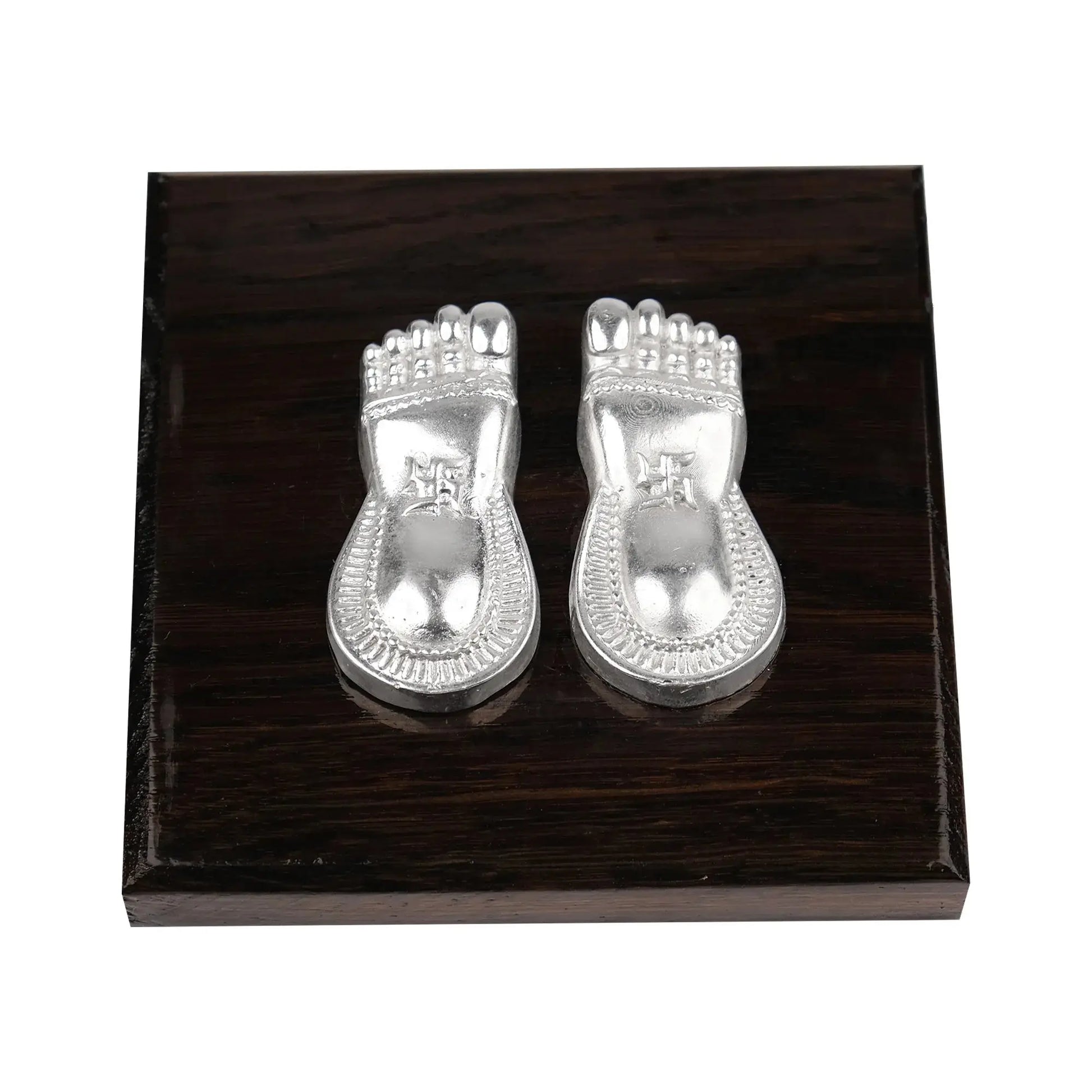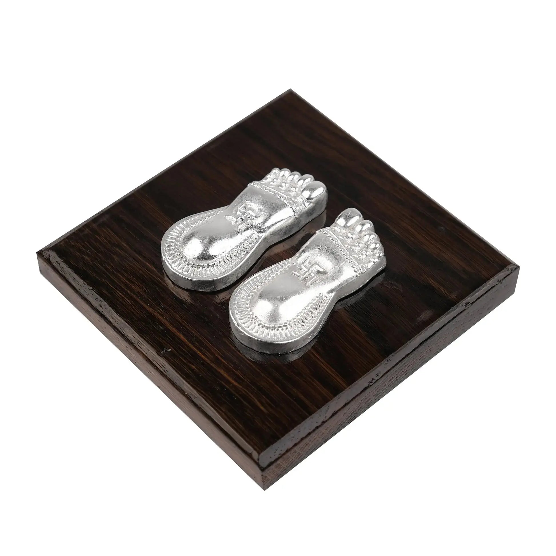 Bring home an aura of prosperity and divine grace with the Silver Plated Laxmi Charan Paduka with Wooden Base from Artarium. Symbolizing the sacred footsteps of Goddess Lakshmi, this spiritual decor piece is believed to welcome abundance, peace, and positive energy into your space. The refined silver plated finish lends it a luminous, auspicious presence, while the wooden base adds warmth, stability, and a touch of traditional elegance. Designed to complement both classic and contemporary pooja settings, it enhances the sanctity of mandirs, altars, and devotional corners with effortless grace. Thoughtfully crafted to reflect devotion and cultural heritage, this Charan Paduka creates a serene spiritual atmosphere wherever it is placed. Ideal for daily worship or special rituals, it also makes a meaningful gift that conveys blessings, faith, and refined taste for festive and auspicious occasions.