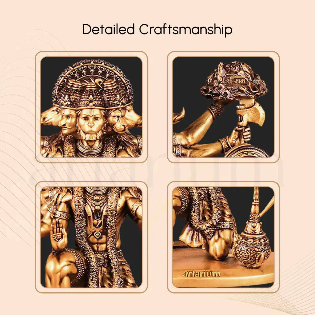 Bring protection and positivity to your vehicle with our beautifully handcrafted Sitting Panchmukhi Hanuman idol for car. This stunning 5 Mukhi Hanuman Ji murti showcases intricate detailing of Hanuman Ji, the 5 Headed Hanuman, gracefully seated and holding his weapons, including a Gada (Mace), Sword, and Trishul. Known as the original Panchmukhi Hanuman, this idol is designed specifically for your car dashboard, serving as a powerful guardian against evil forces and destructive energies. Also referred to as Hanuman Panch Mukhi and Panchamukhi Hanuman Ji, this god idol helps dispel fear and remove vastu doshas, ensuring divine protection.