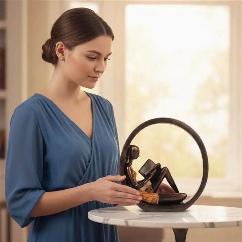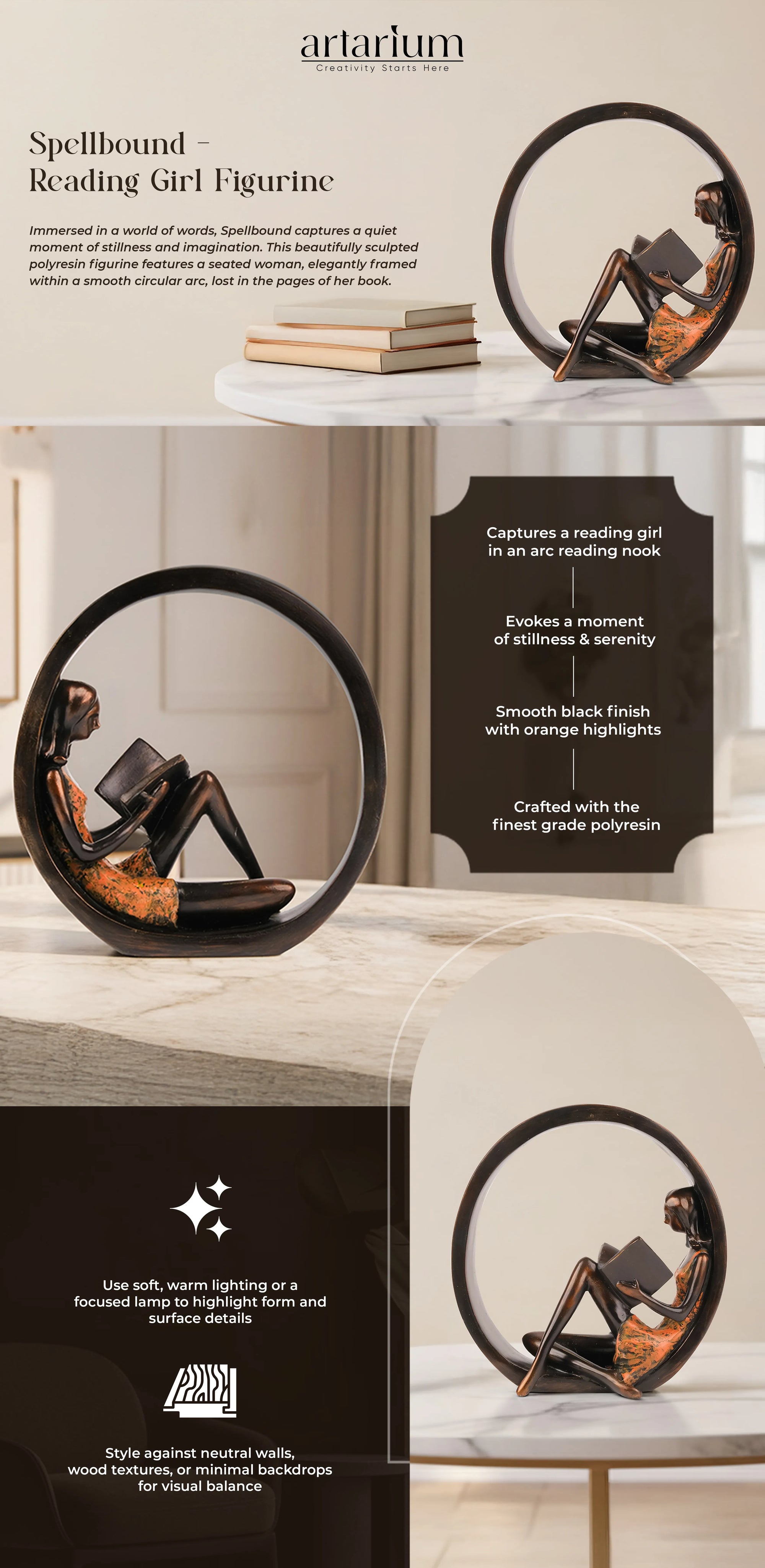 Immersed in a world of words, Spellbound captures a quiet moment of stillness and imagination. This beautifully sculpted polyresin figurine features a seated woman, elegantly framed within a smooth circular arc, lost in the pages of her book. With flowing lines and a bronze-toned finish accented by a textured dress, the piece evokes introspection, serenity, and the timeless pleasure of reading. Perfect for bookshelves, desks, or reading nooks, Spellbound brings warmth and refinement to any space.