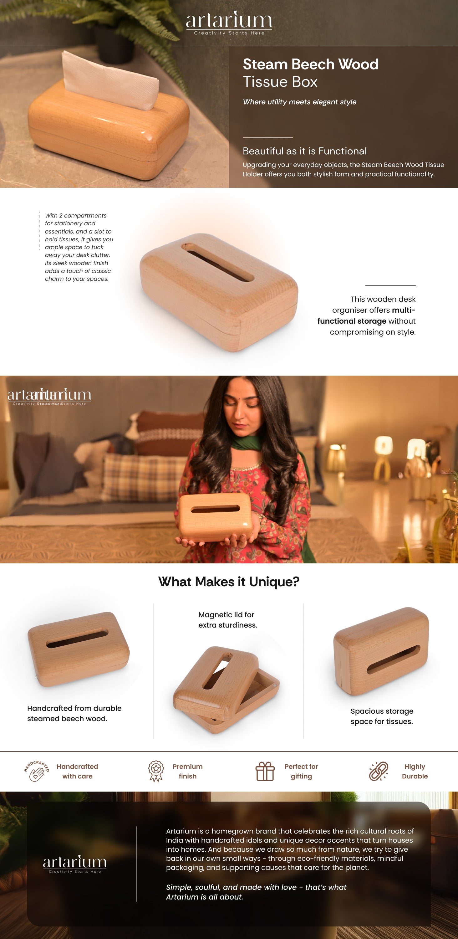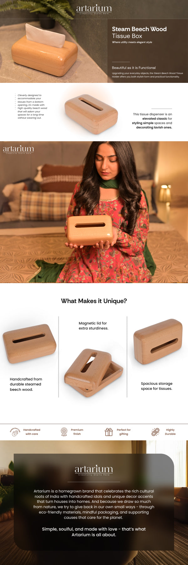Bringing a distinct charm to everyday objects, the Steam Beech Wood Tissue Holder offers you both form and functionality. This tissue dispenser is ideal for elevating simple spaces and decorating lavishing ones. It has been cleverly designed to accommodate your tissues from a bottom opening and have them retrieved easily through the slot hole at the top. Made from high-quality wood, this beautiful tissue box holder can be placed anywhere in your home and be just as beautiful as it is functional.