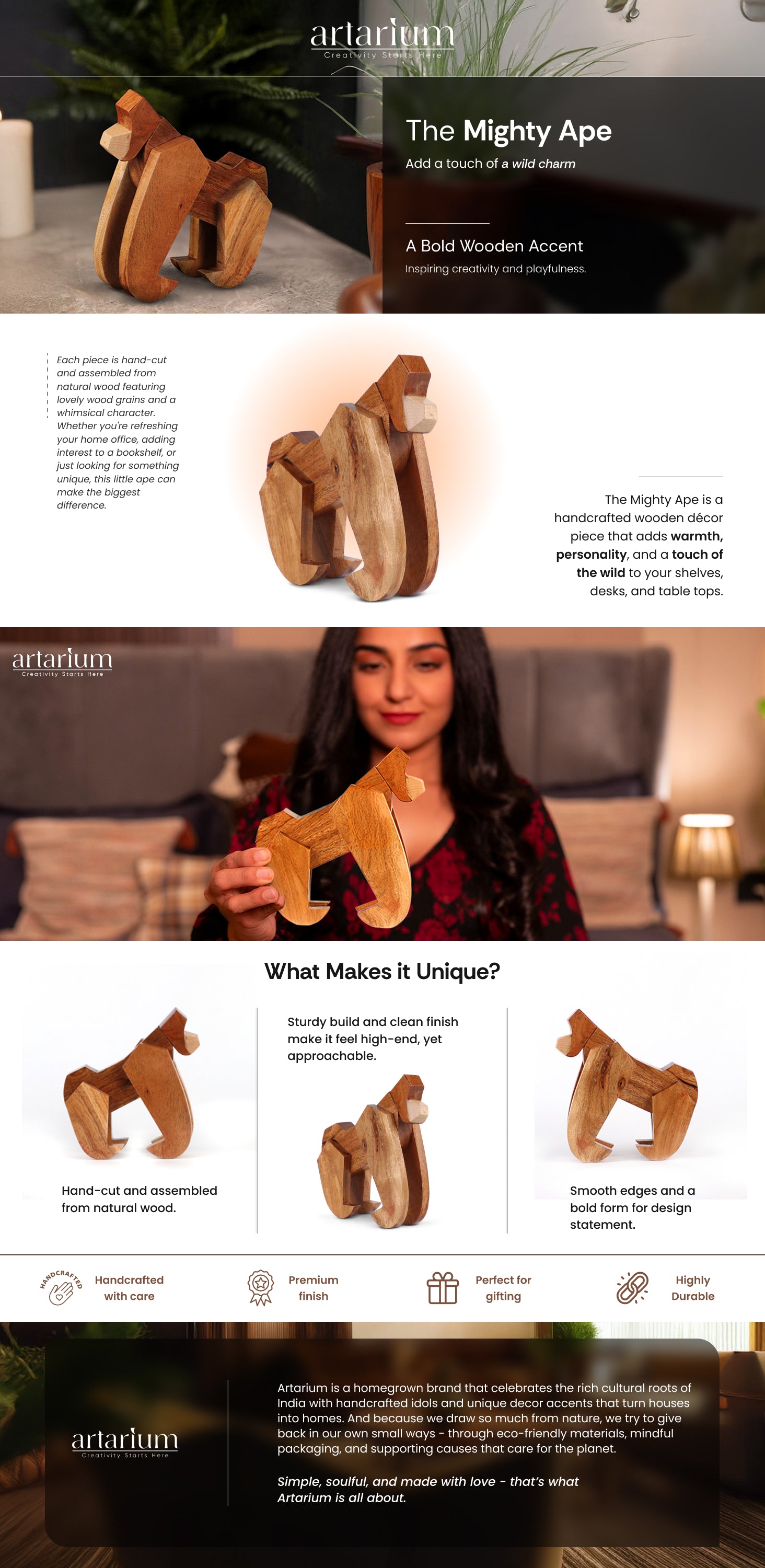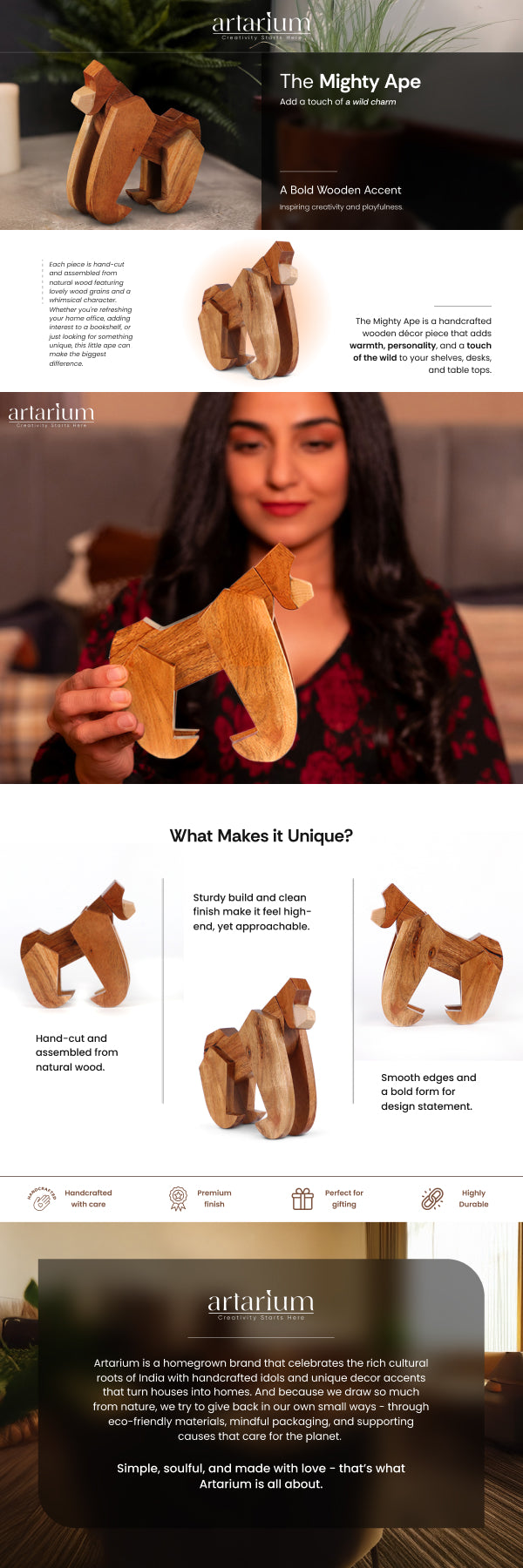 Bring a hint of jungle adventure to your home with this charming handcrafted wooden ape. Made from smooth, high-quality wood, this sturdy yet playful addition will inspire imagination and creativity, giving you a unique wood sculpture for any place. This home decor item adds a natural and eco-friendly touch to your space while its simple and minimalist design adds to any room it’s kept in.