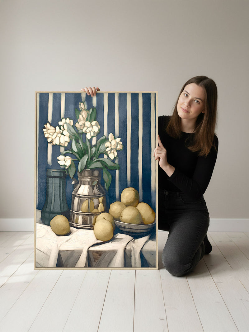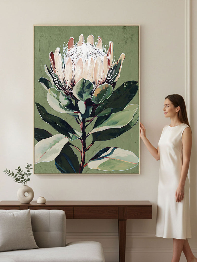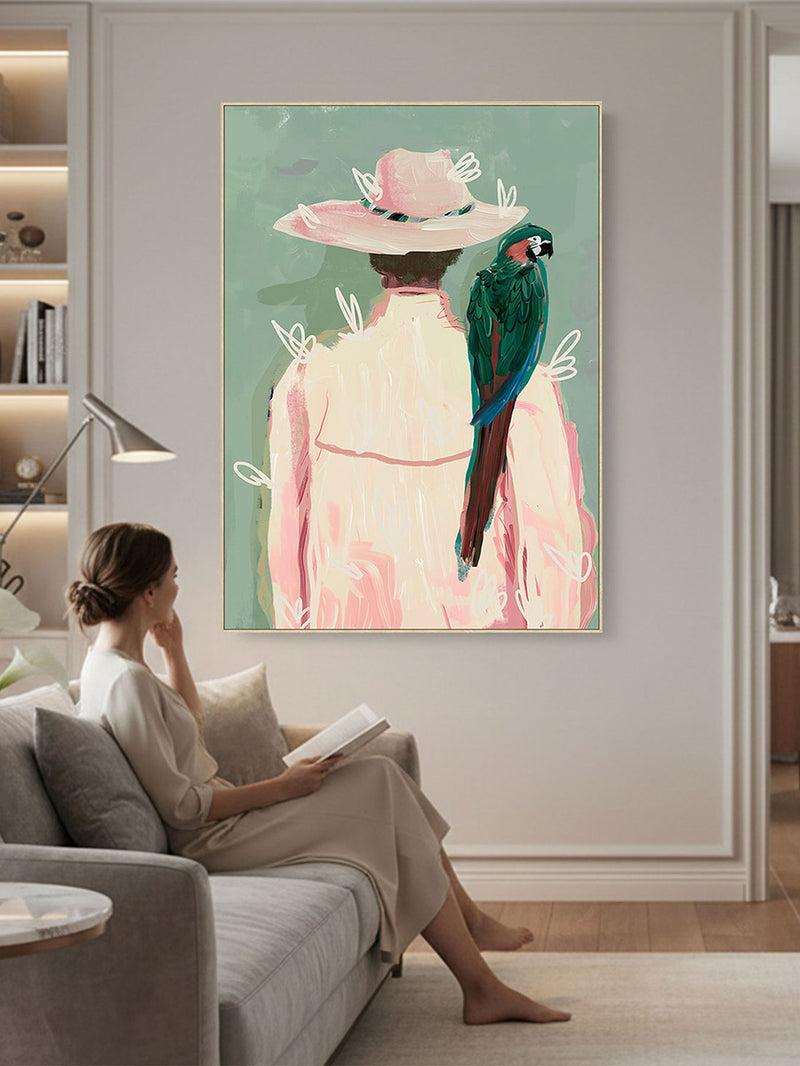 Elevate your interior with The Parrot Keeper, a sophisticated blend of modern elegance and exotic allure. This exclusive artwork captures the quiet poetry of a lone Englishwoman, adorned in soft pastels and crowned with a wide-brimmed hat, as a regal parrot rests delicately on their shoulder. Expressive palette-knife strokes and abstract botanical motifs drift across a muted sage backdrop, evoking a sense of effortless grace and calm. A harmonious fusion of color, texture, and composition, it brings depth and distinction to contemporary interiors.
