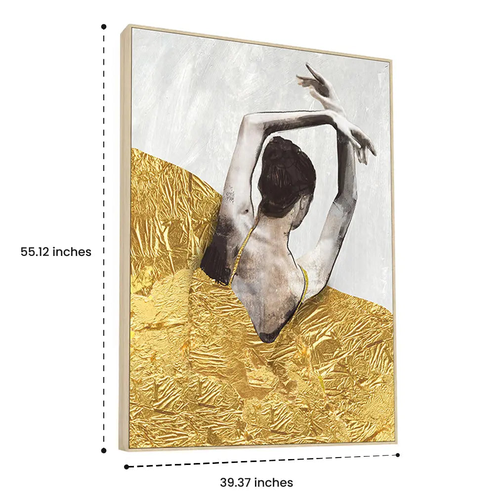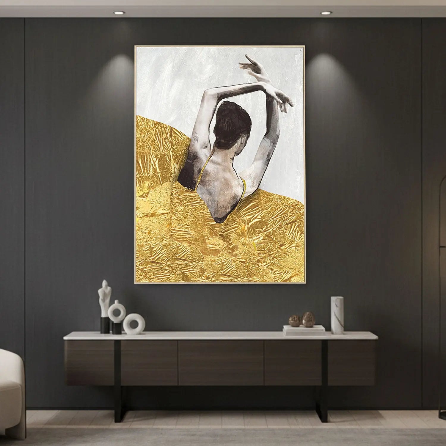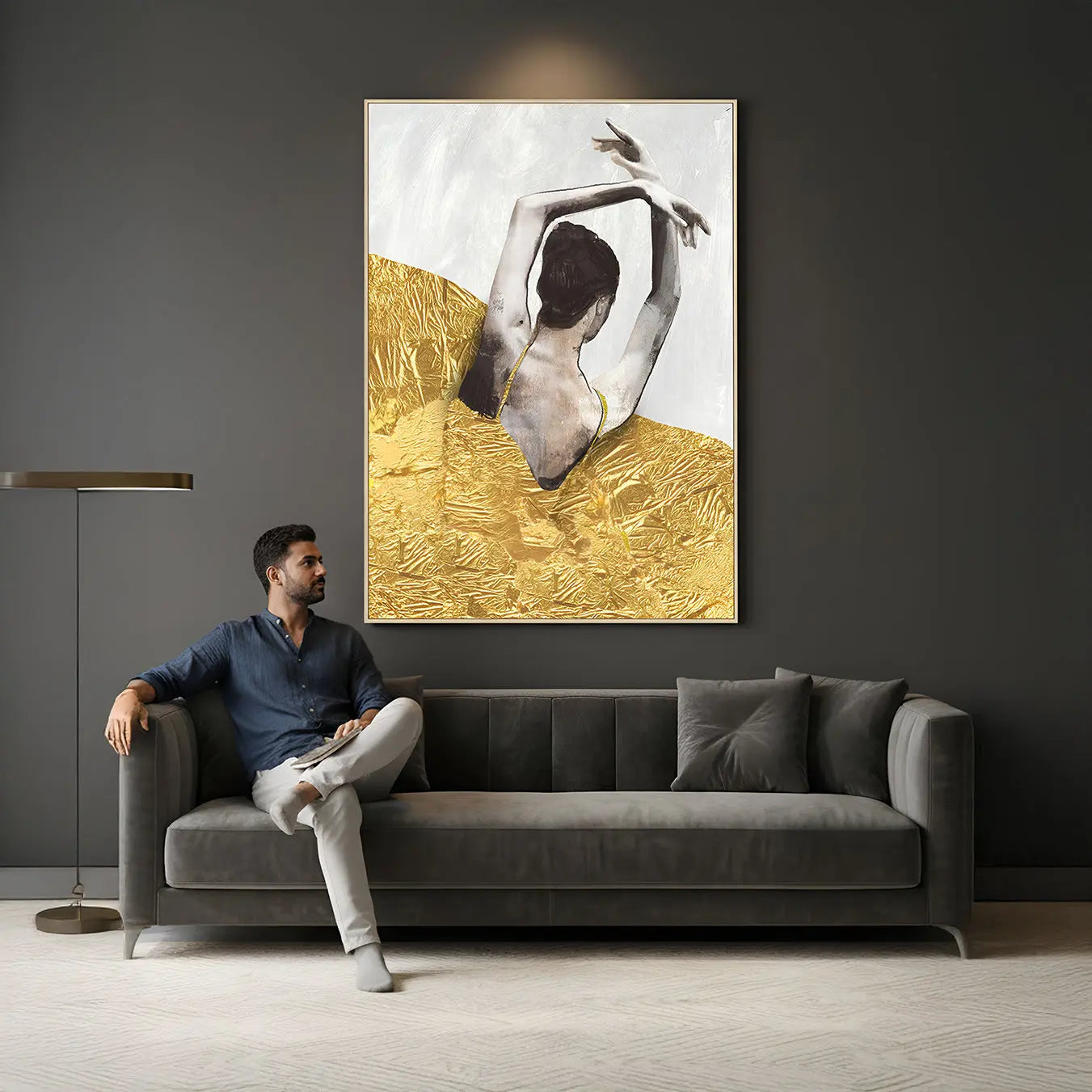 An ode to poise, power, and timeless femininity, The Star Ballerina is a striking study that captures the quiet elegance of a Ballerina mid-motion, immortalized in a moment of serene refinement. Rendered in a harmonious fusion of mixed media textures, the composition combines soft grayscale tones with lustrous gold detailing that radiates opulence. The crinkled golden foil effect evokes luxury, wrapping the figure in a fluid, sculptural elegance that demands attention.