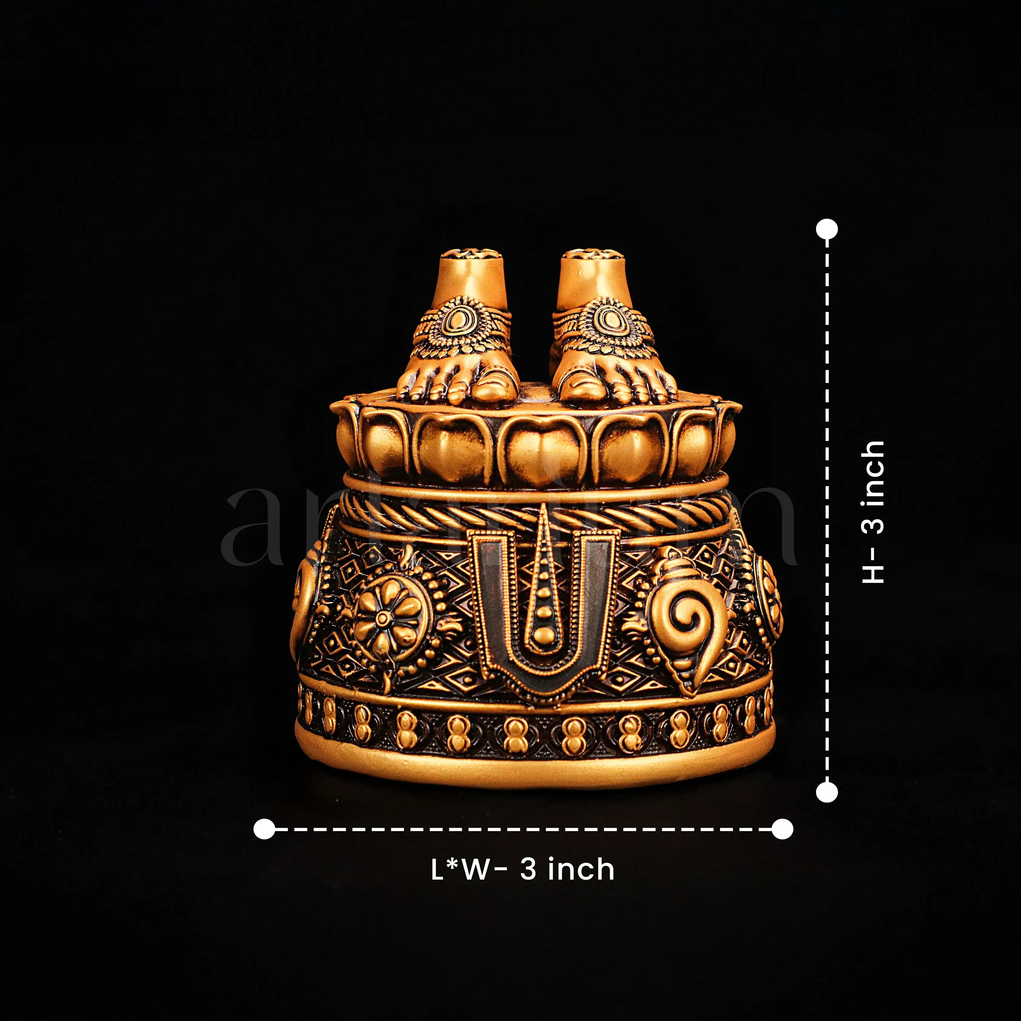 Find all that you seek under the feet of the divine with the Tirupati Balaji Charan Paduka. This intricately crafted piece depicts the sacred footprints of the Lord Tirupati Balaji, bringing blessings of peace and prosperity to any space. A cushioned pedestal keeps the feet from the ground, symbolizing that God is above the mundane world. Each aspect of this idol is intricately detailed - from the adornments on the feet to the beautiful carvings on the base. Completing the picture are the auspicious symbols of Vaishnava Tilak, divine chakra, and the shankh (conch shell). Crafted from high-quality material, this token of divinity will remain a lasting addition to your home.