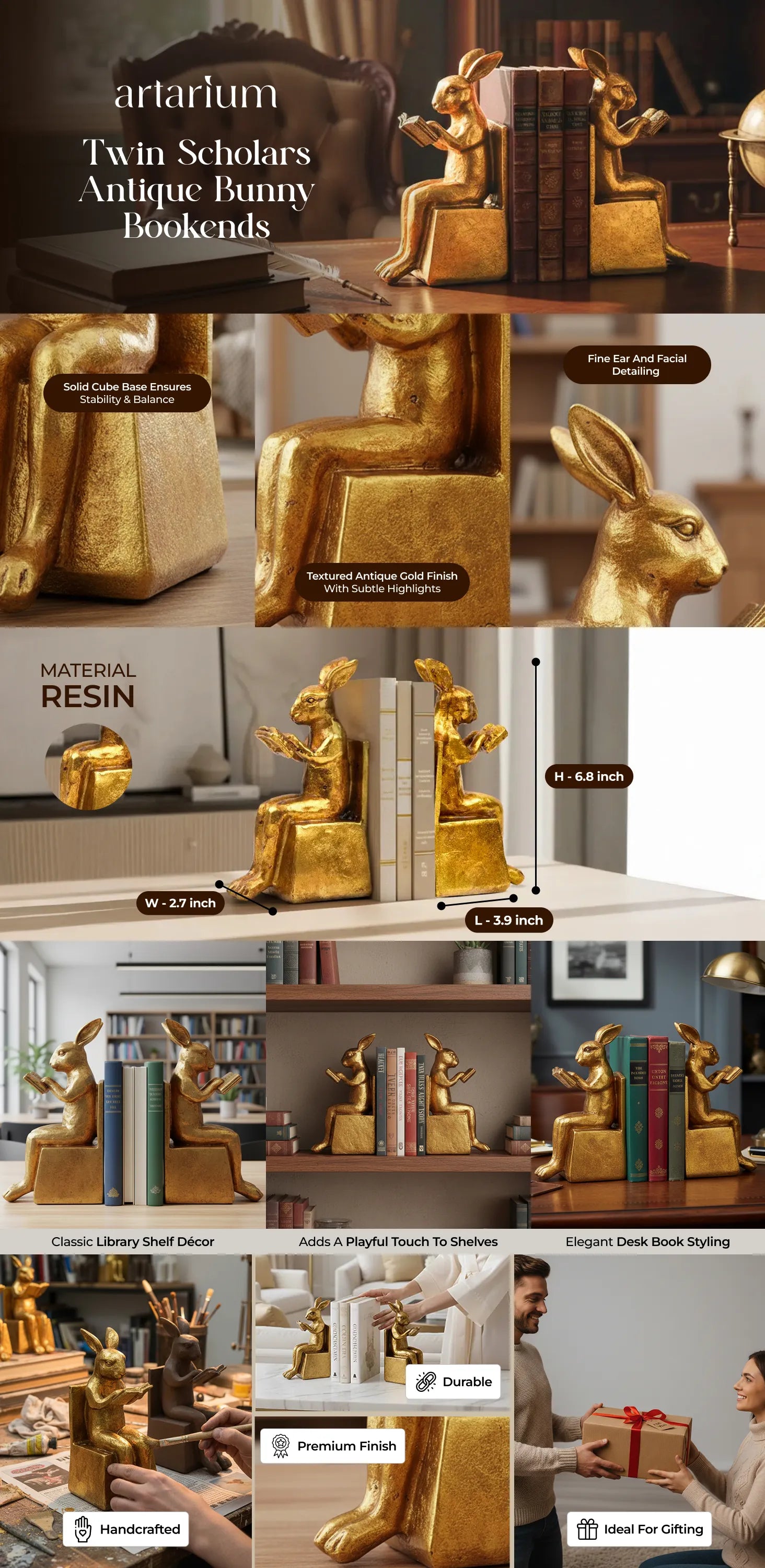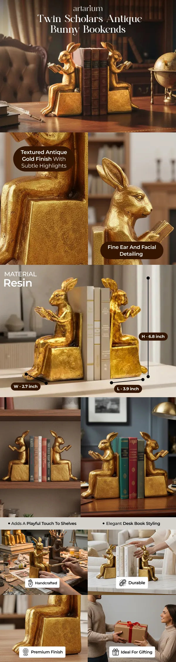 Add a touch of whimsical personality to your bookshelf with these vintage bunny bookends coined Twin Scholars. Crafted in an antique finish, these exude the old-world charm of a rare collector’s item, emanating a quiet luxury with its golden-toned hues. Use as bookends or as stand-alone showpieces!
