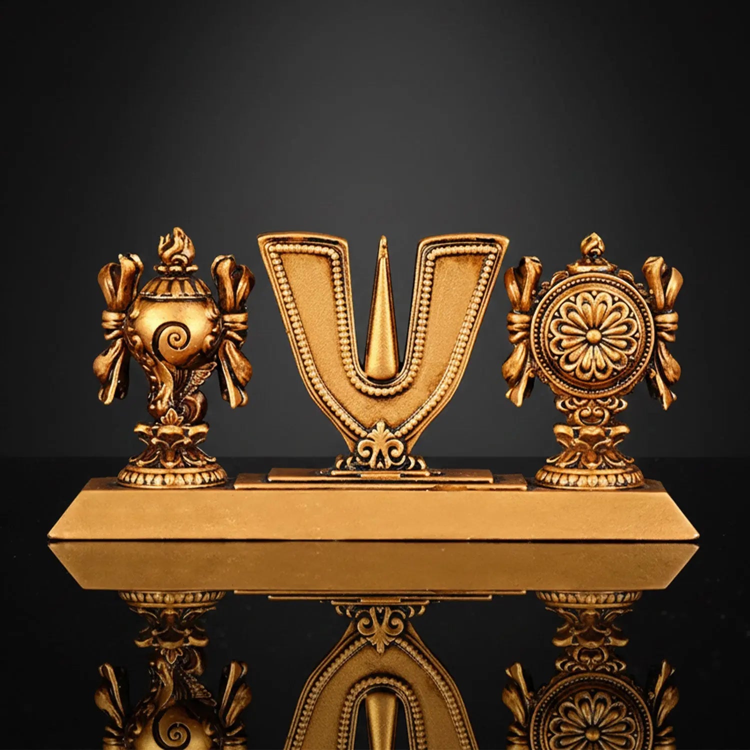 Vaishnav Tilak, a beautifully designed art piece brings these three potent symbols in a single composition. At the center, is the Vaishnava Tilak, wherein the two outer lines represent the feet of Narayana, and the line in the middle represents his consort, Lakshmi. On the left is the Chakra which represents the wheel of time and on the right is the Shankha, representing the sound of creation.