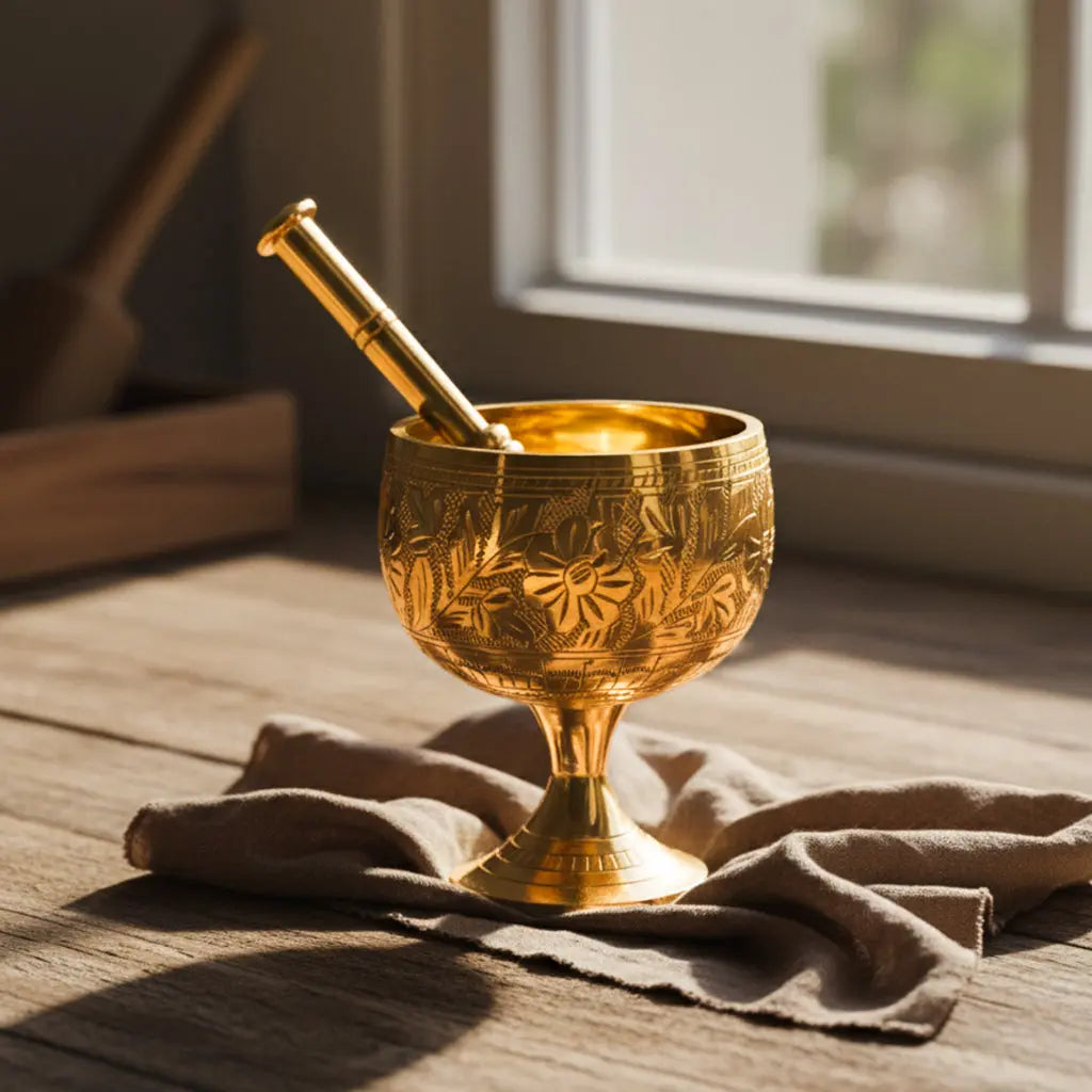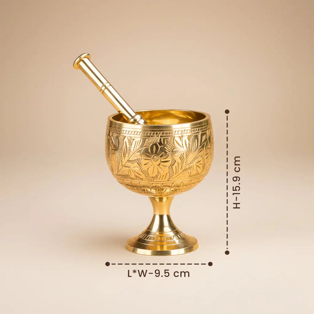 Let loose an array of earthly and herbal aromas in your kitchen with our Engraved Mortar and Pestle. Infuse rich flavors in your beverage and meals with a regal charm. This mortar and pestle are carefully cast in high-grade brass and detailed by hand. The beautiful floral engravings make it the center of attention in every kitchen and a pleasure to use. You can quickly grind saffron, vanilla or other supple spices into powder and unlock delectable flavors with an old-world charm.