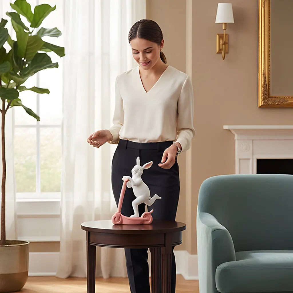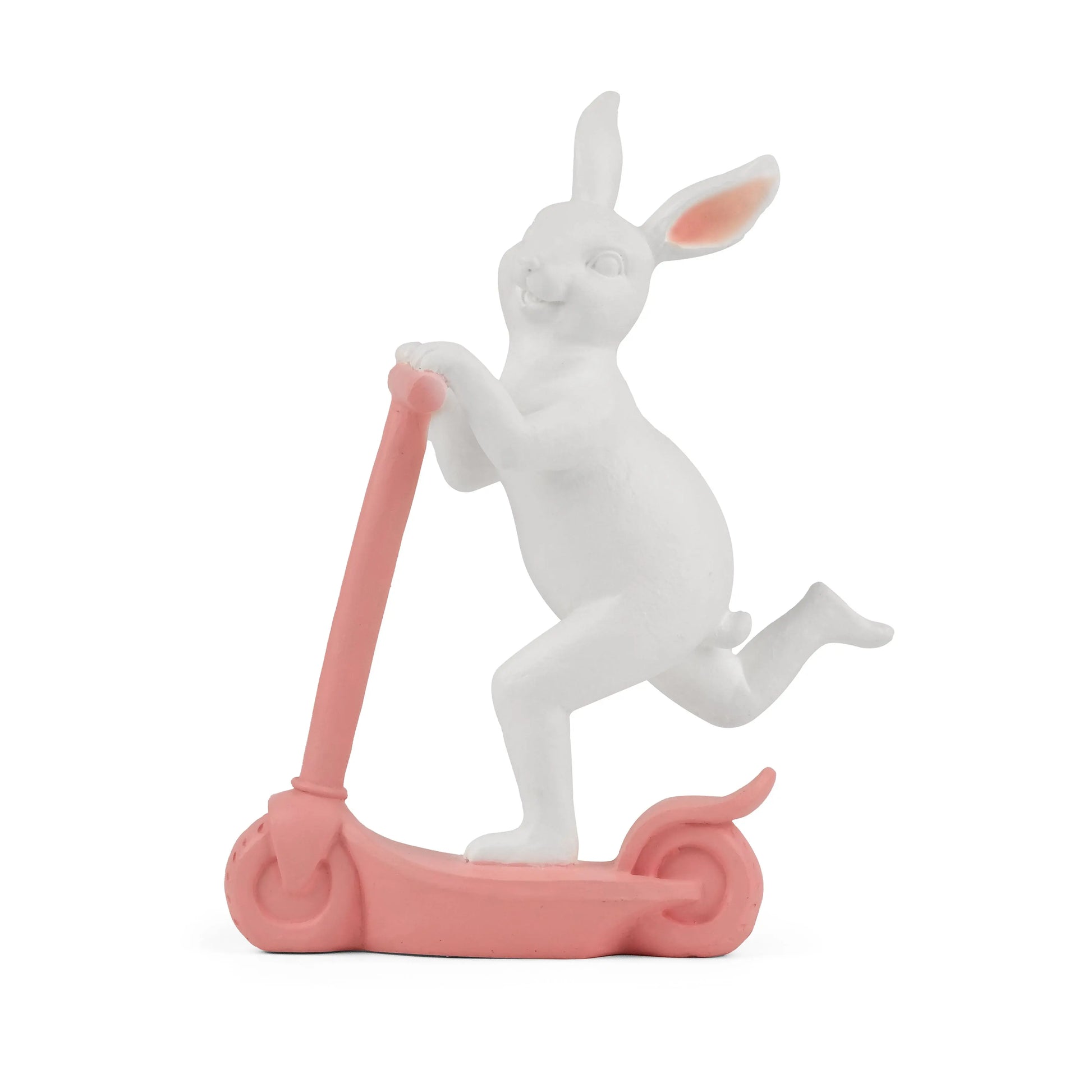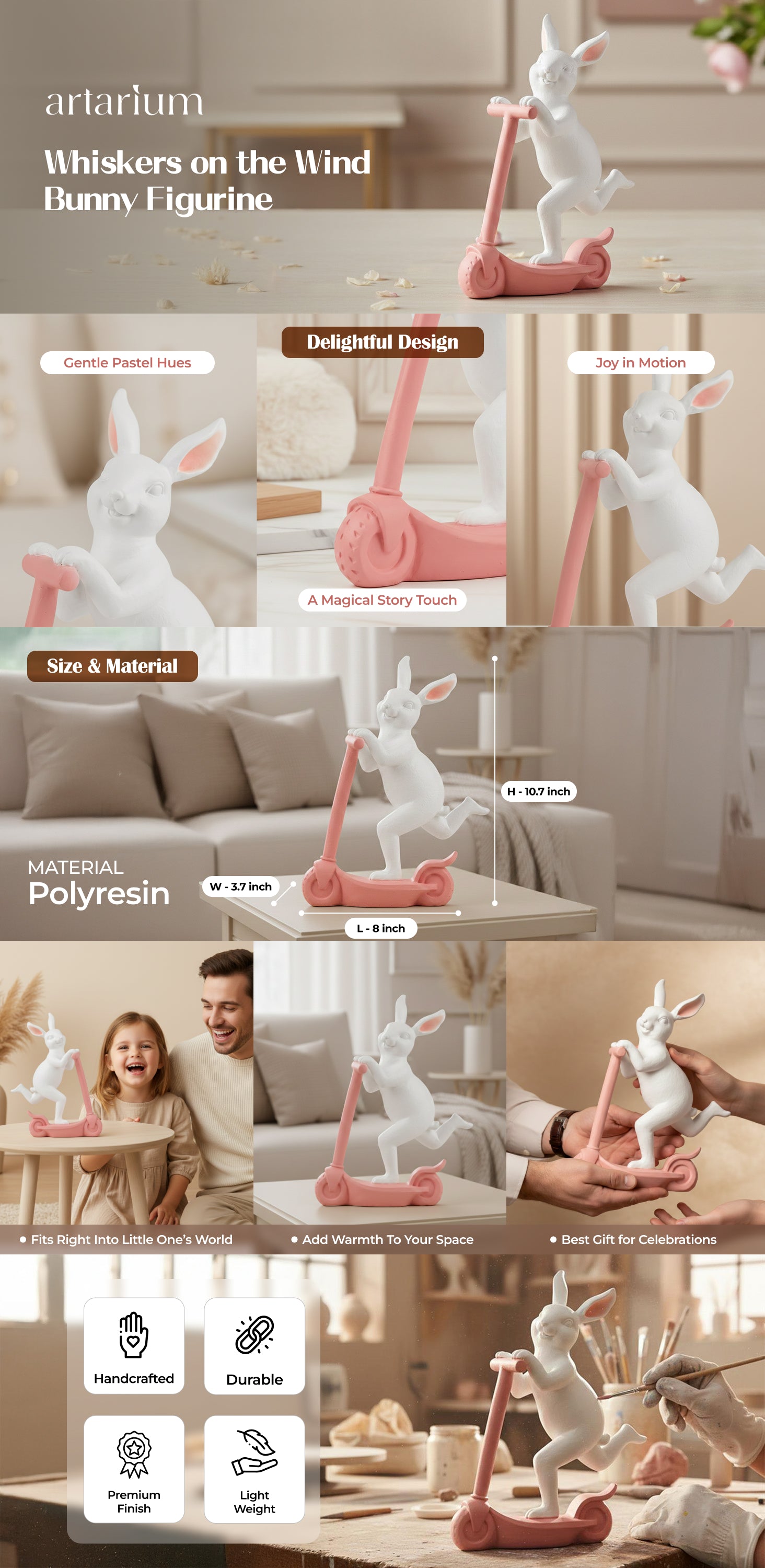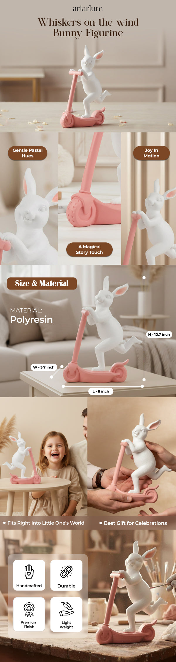 Full of whimsy and motion, Whiskers in the Wind captures the delight of a breezy ride. This figurine features a joyful white bunny balancing confidently on a pastel pink scooter, one foot lifted mid-glide and ears perked with excitement. Crafted from premium materials and finished with soft tones, it’s a playful nod to the spirit of adventure. Perfect for nurseries or cheerful corners of your home, this piece brings a smile wherever it rolls in.