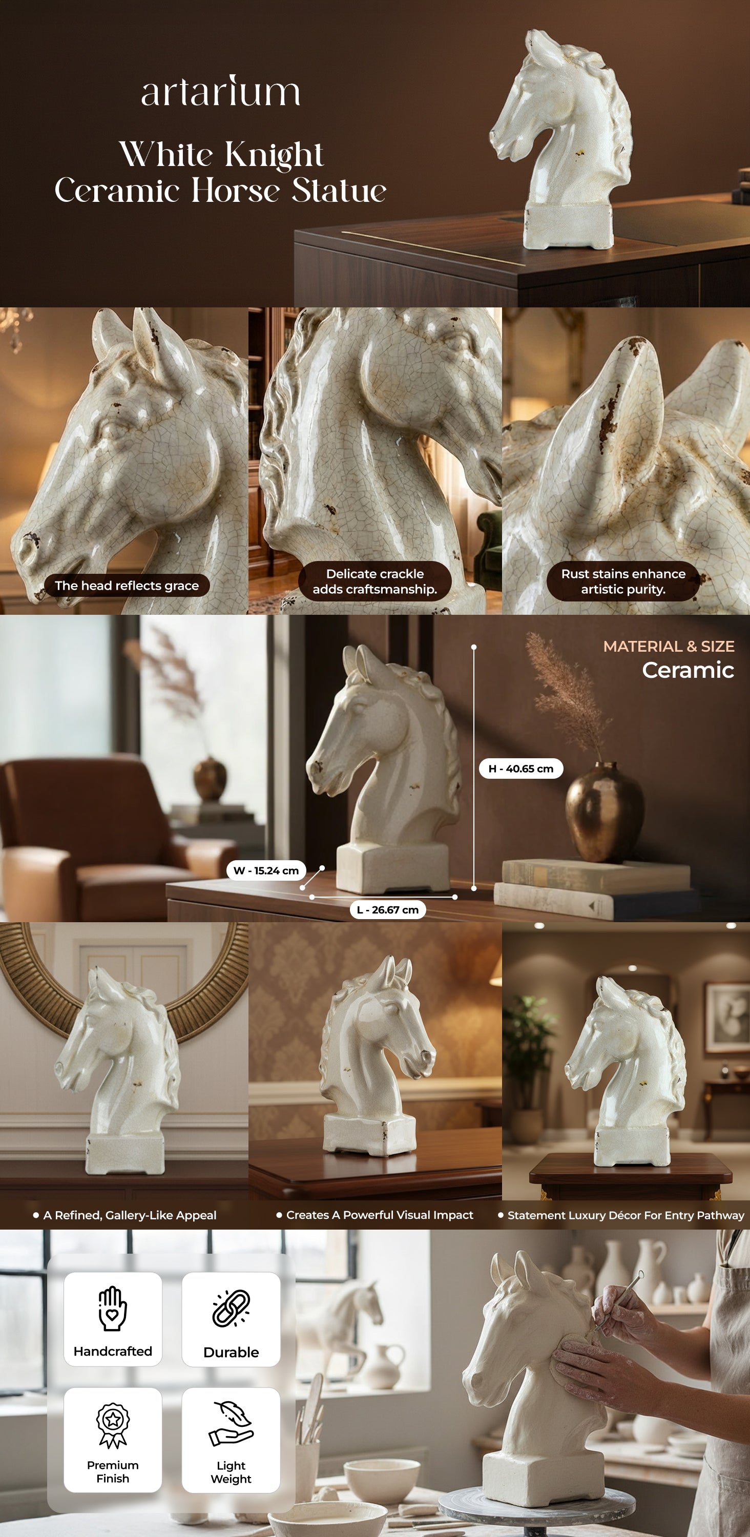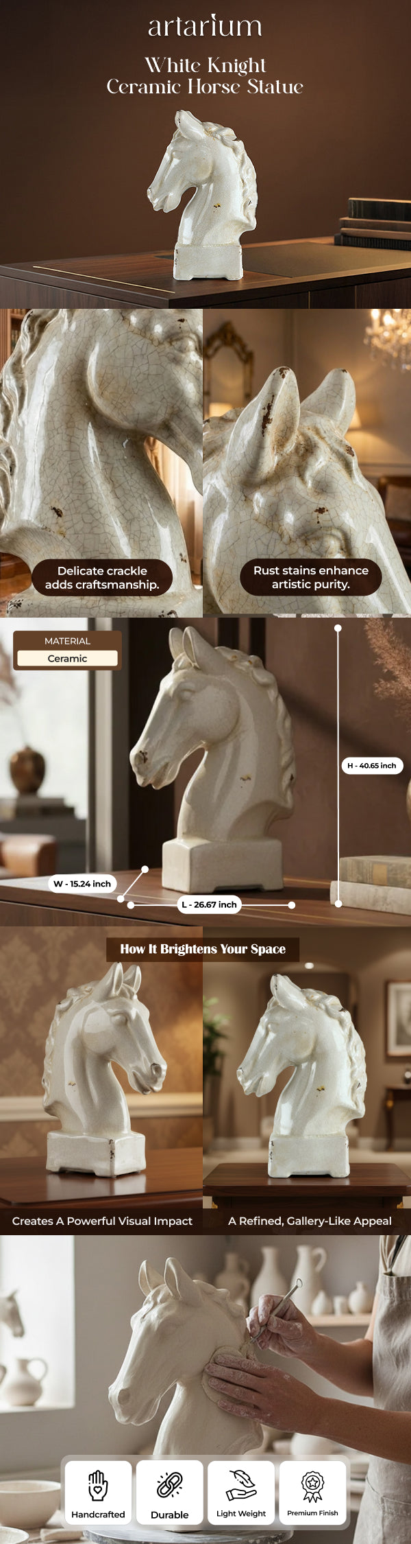 With its noble stance and vintage finish, the White Knight ceramic horse figurine evokes the elegance of a bygone era. Sculpted in ceramic and finished in a gently crackled glaze, it recalls the stately charm of antique chess pieces and equestrian sculptures. Flecks of distressed detail lend it a heritage feel, making it a striking accent for mantels, bookshelves, or console tables.