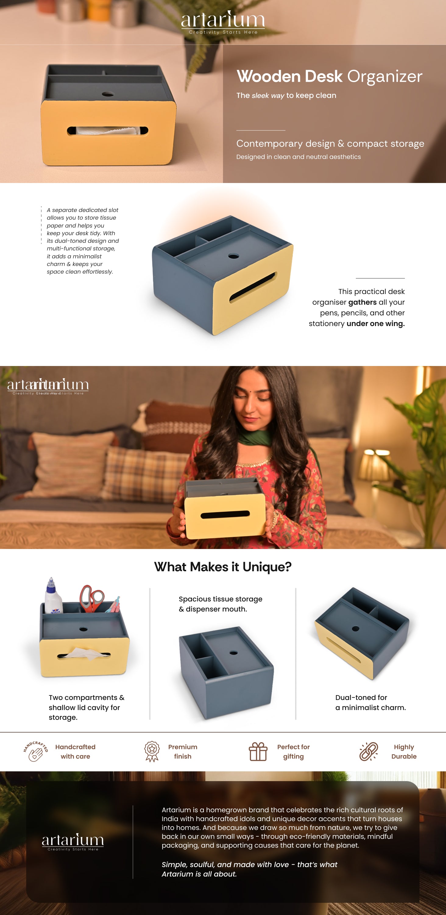 Get organized with our Wooden Desk Organizer. This practical piece gathers all your pens, pencils, and other stationery under one wing. A separate dedicated slot allows you to store tissue paper and helps you keep your desk tidy. Designed with sleek and neutral aesthetics, this stationery box can suit any space effortlessly.