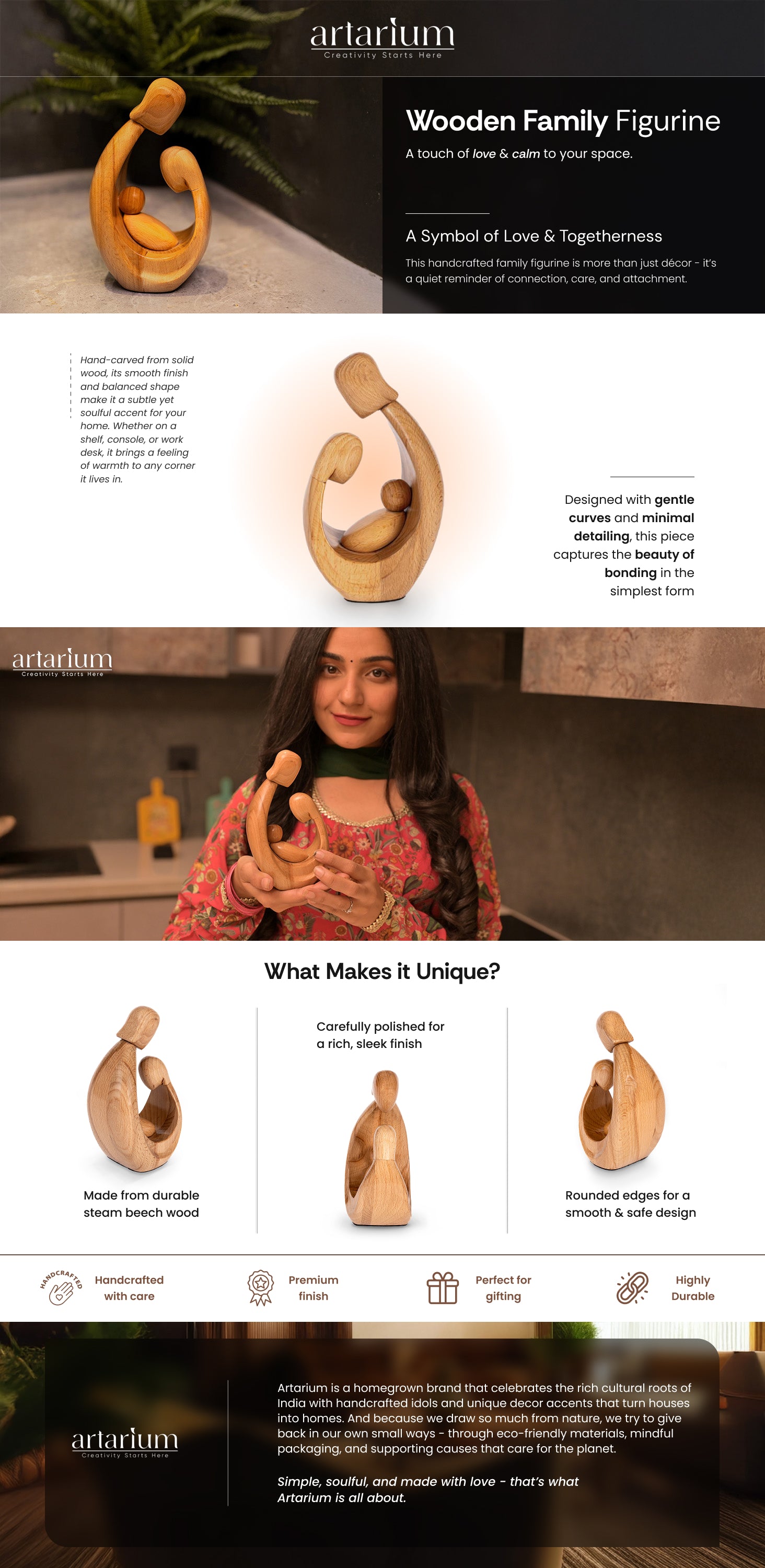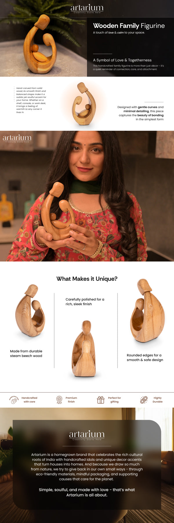The Wooden Family Sculpture evokes a sense of togetherness, safety, and warmth with a creative design that showcases a father-figure, a mother figure, and a child in between. This wood decor item breathes new life into your space, inviting love, protection, and a sense of togetherness.