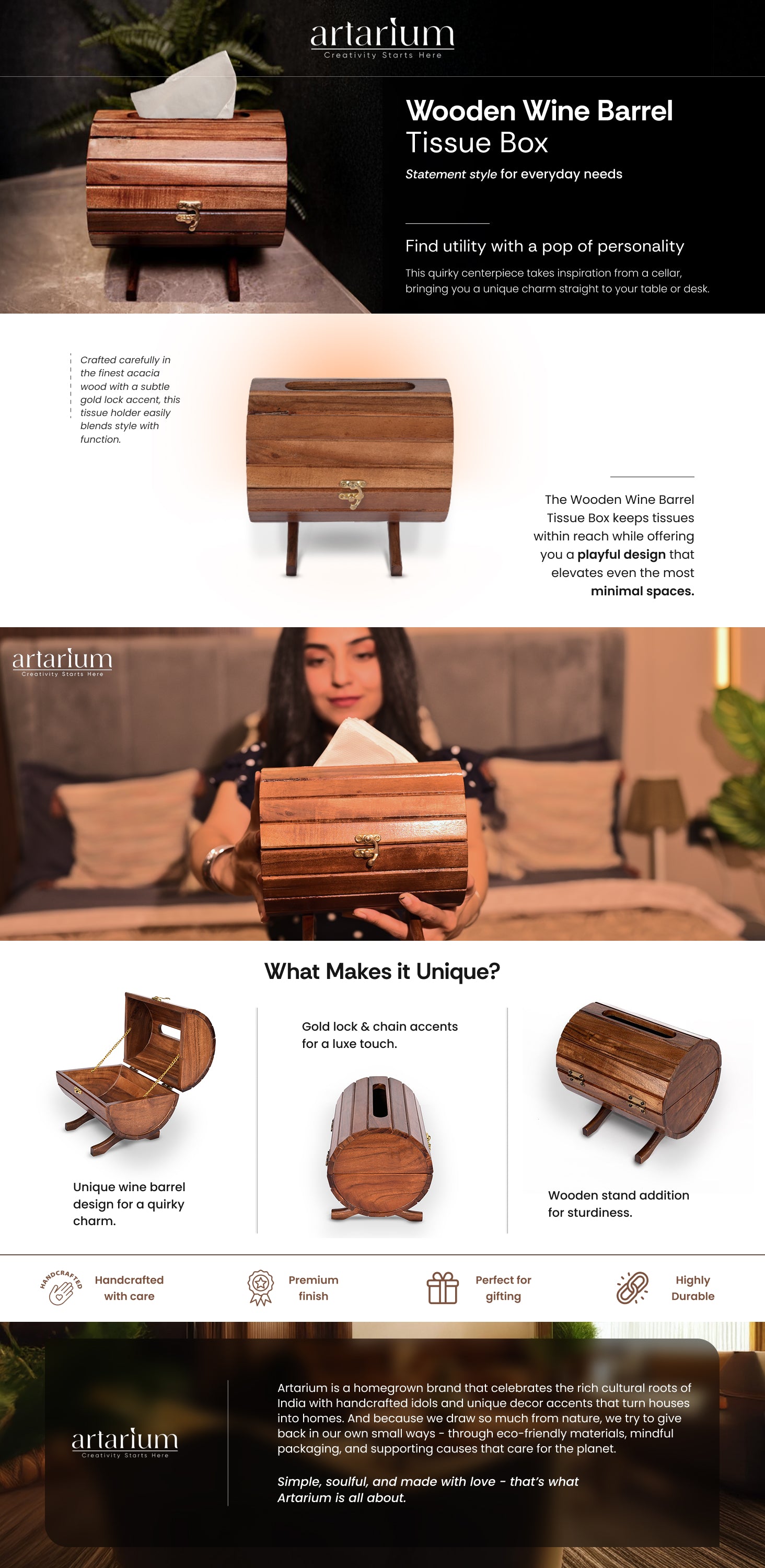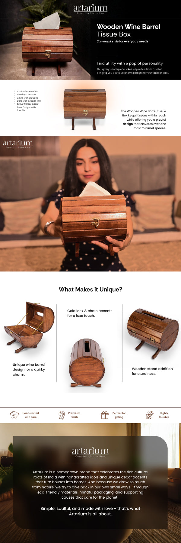 This quirky centerpiece takes inspiration from a cellar, bringing you a barrel of wine straight to your table or desk. The Wooden Wine Barrel Tissue Box keeps tissues within reach while offering you a playful design that elevates even the most minimal spaces. Crafted carefully in the finest acacia wood, this tissue holder is as stylish as it is functional. You can easily refill it and clean up messes with utmost ease.