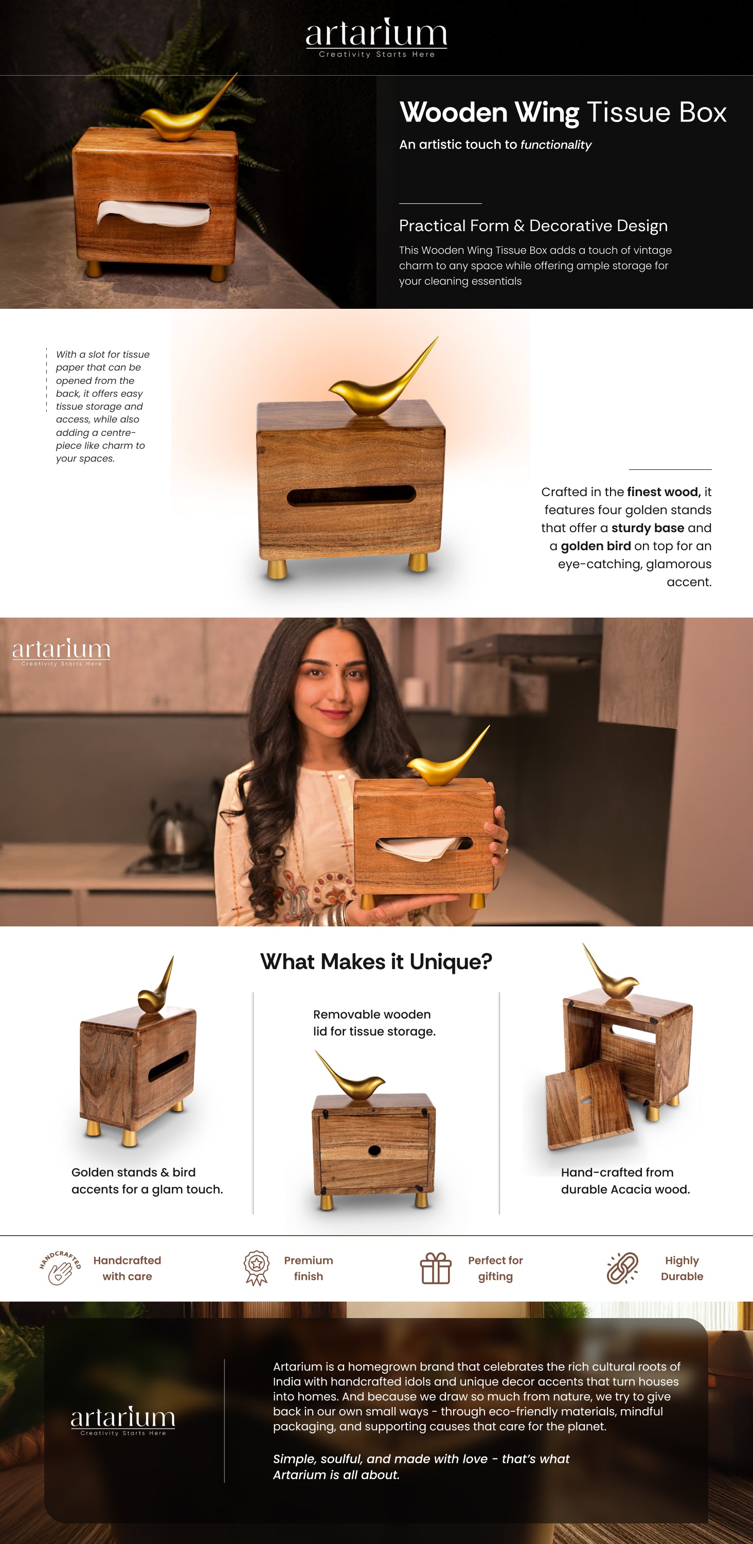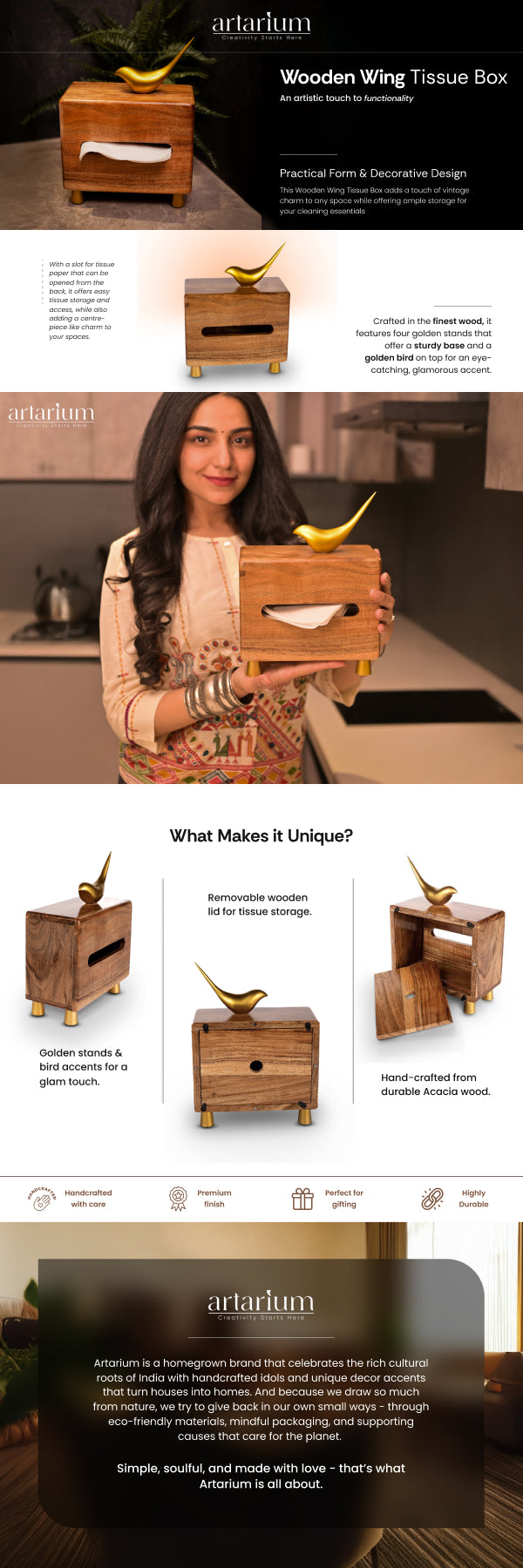 The Golden Bird Wooden Tissue Box adds a touch of vintage charm to any space. Crafted in the finest wood, this Tissue Box features four golden stands that offer a sturdy base and a golden bird on top that instantly catches the eye. The smooth exterior with a fine wooden finish exudes a timeless elegance, while the golden accents add a touch of glamour.